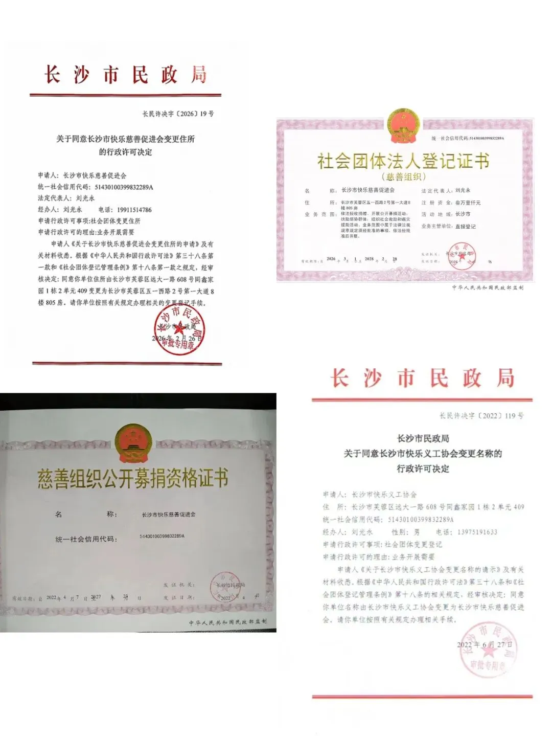 长沙市快乐慈善促进会是长沙市民政局登记的AAA级慈善组织,始于2013年7月6日创立的快乐义工群,2014年6月6日依法登记为“长沙市快乐义工协会”,2017年认定为慈善组织,2019年成立党支部并获评AAA级(持续至今),2022年获公开募捐资格并更名为长沙市快乐慈善促进会。促进会具备免税及公益性捐赠税前扣除资格,接受长沙市民政局等相关部门指导监督。自成立以来,促进会始终坚守公益初心,历经十余年深耕,实现了从义工服务到专业慈善的跨越式发展,促进会累计开展活动700余场、发放款物近4000万元。义工协会时期,为24所贫困学校捐建图书室,资助大学生45名,帮扶困境群体300余人,开展禁塑、垃圾分类等宣传活动,“两型知识宣传进社区”获市级公益项目创新奖,是市级公益宣讲单位。2022年取得公开募捐资格并更名后,确立了“倡导‘参与、互助、奉献、进步’的志愿者精神,弘扬扶贫济困的优良美德,开展多种形式的慈善、志愿服务活动,积极参与社会救助与乡村振兴,促进公益慈善事业发展”的宗旨,构建起多元筹募、精准帮扶、公益生态共建三大核心体系。核心业务包括“依法接收各类捐赠、公开开展社会募捐;扶助弱势群体,参与社会救济、赈灾援助、扶贫工程等;推动科教文卫、环保食安、乡村振兴等公益事业发展;开展志愿者招募、培训与表彰,整合公益资源;普及公益知识,开展公益理论研究;加强慈善交流协作,协助策划实施公益项目”等.打造“快乐护青苗”“快乐护星儿”“致敬逆生长”“热心肠·热乎饭”等四大品牌项目。拓展大病救助、乡村振兴等新阵地,2023年创建“红印我心”党建品牌,年度筹款破千万元,2025年拨付帮扶款物超千万元、受益人超万人,合作项目——致敬行善者已为长沙市行善者及其相关机构累计筹集致敬、帮扶款物过千万元,目前正筹备“快乐树人”助学项目、打造乡村振兴示范项目——“同庆红色小镇”,持续深化公益服务内涵。致力于搭建专业、透明、高效的慈善平台,凝聚社会各界力量,推动公益慈善事业高质量发展,让善意传递到每一个需要帮助的角落。