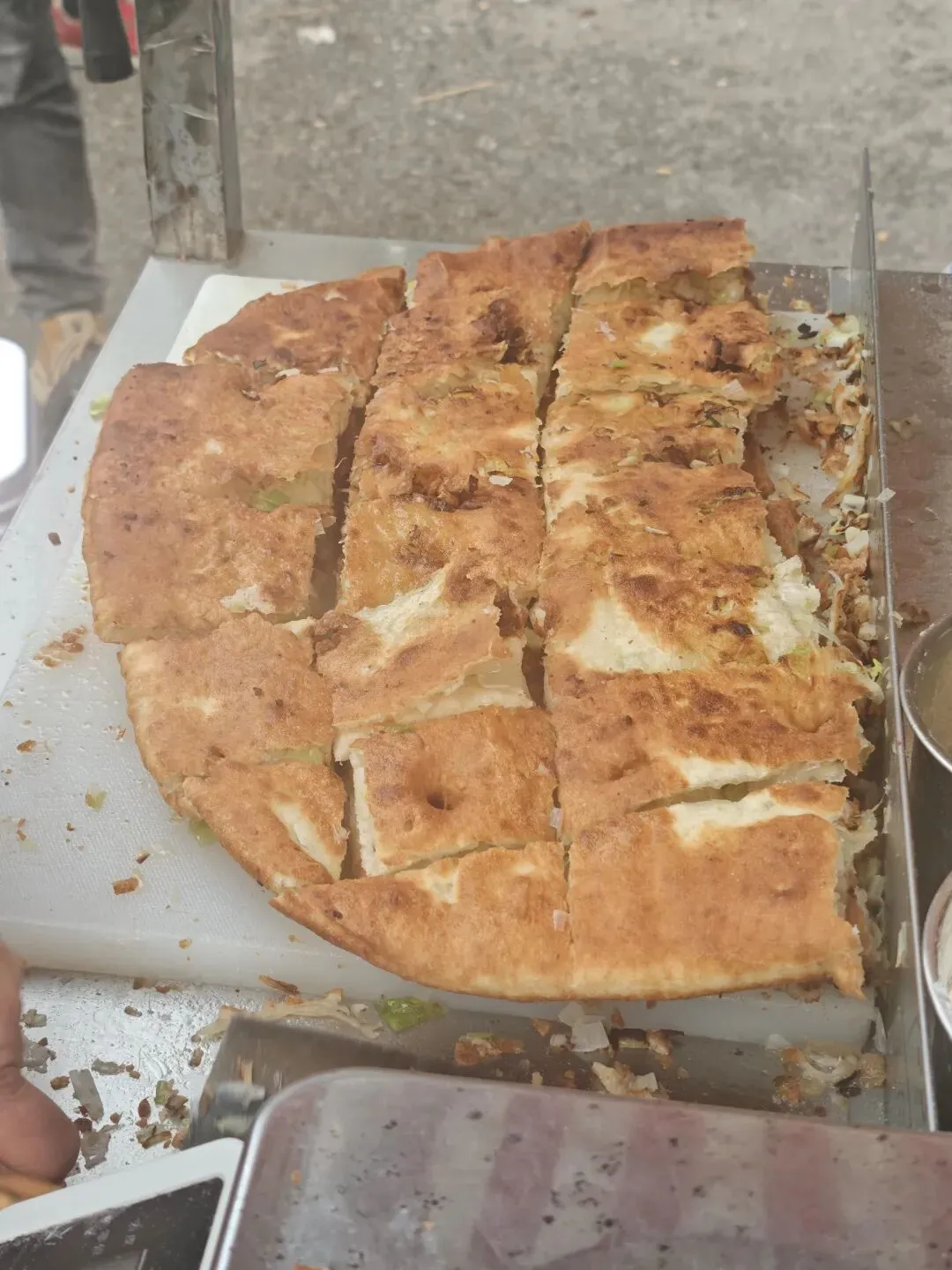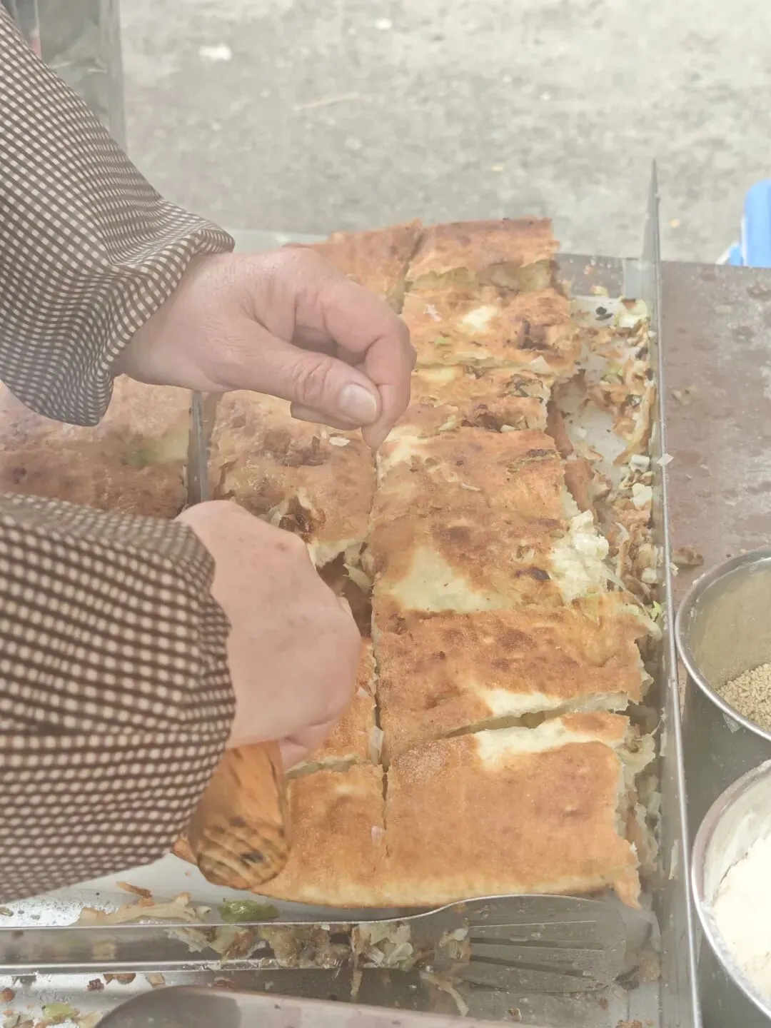 他家的饼,香是第一杀手锏!每一张大饼都塞了满满当当的大白葱,现擀现烤的过程中,葱香混着面香、油香不断往外溢,还没轮到自己,光是飘过来的香味就让人馋到直咽口水。咬上一口,满嘴都是浓郁又清新的葱香,不是那种刺鼻的葱味,是烤得焦香、越嚼越香的醇厚葱香,瞬间唤醒味蕾!