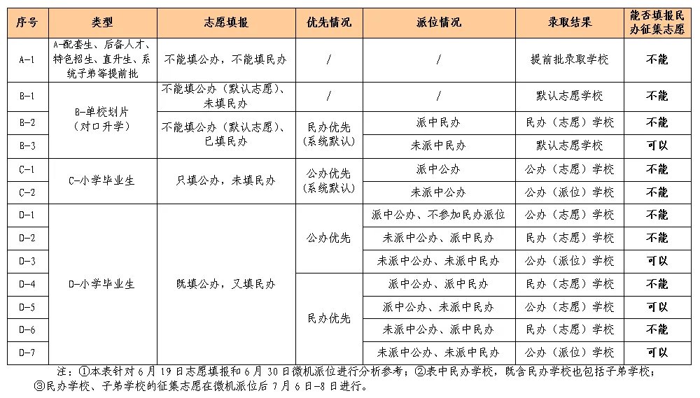 ⑤已被提前录取的配套入学学生、九年制小学部直升学生,特色学校录取学生、项目基地后备人才等均不再参加微机派位以及有富余学位民办学校、子弟学校的征集志愿招生。