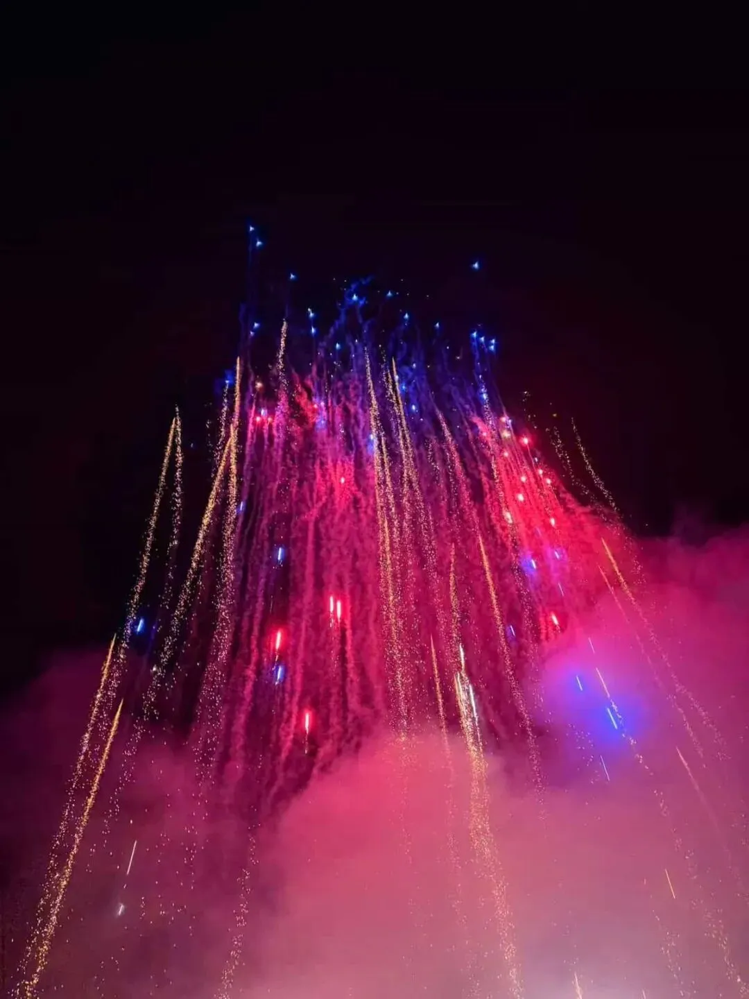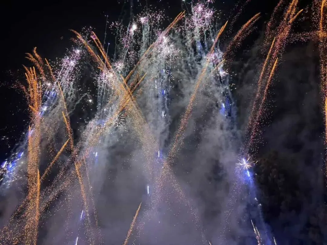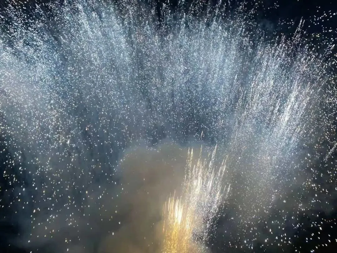 点火、后退、抬头,接着便是夜空被骤然点亮。银白、金色、蓝紫与火光层层压下来,像一场铺满头顶的瀑布,也像把这一晚的欢聚一口气推到最明亮的瞬间。有人惊叹,有人忙着拍照,也有人只顾仰着头“哇”个不停。