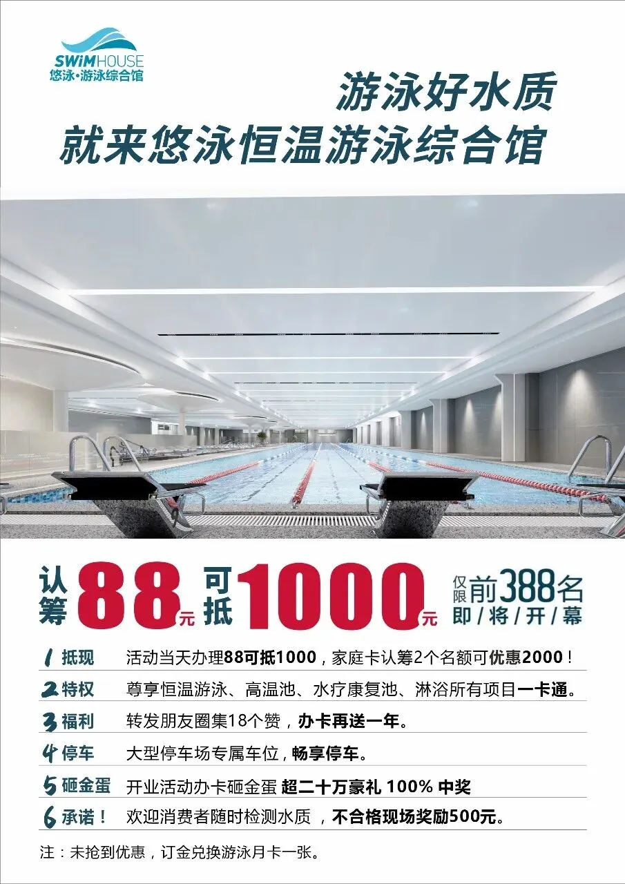 开盘后,您若不满意,在我们会所前台无条件换取游泳VIP通用游泳月卡作为消费保障