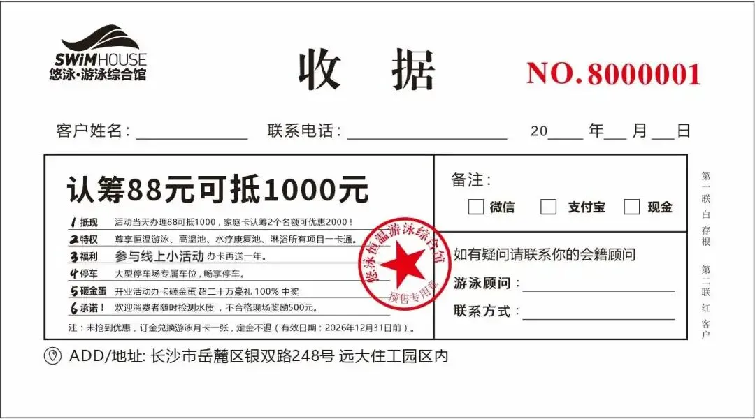 注: 如有任何不满意,定金可兑换游泳月卡作为消费保障