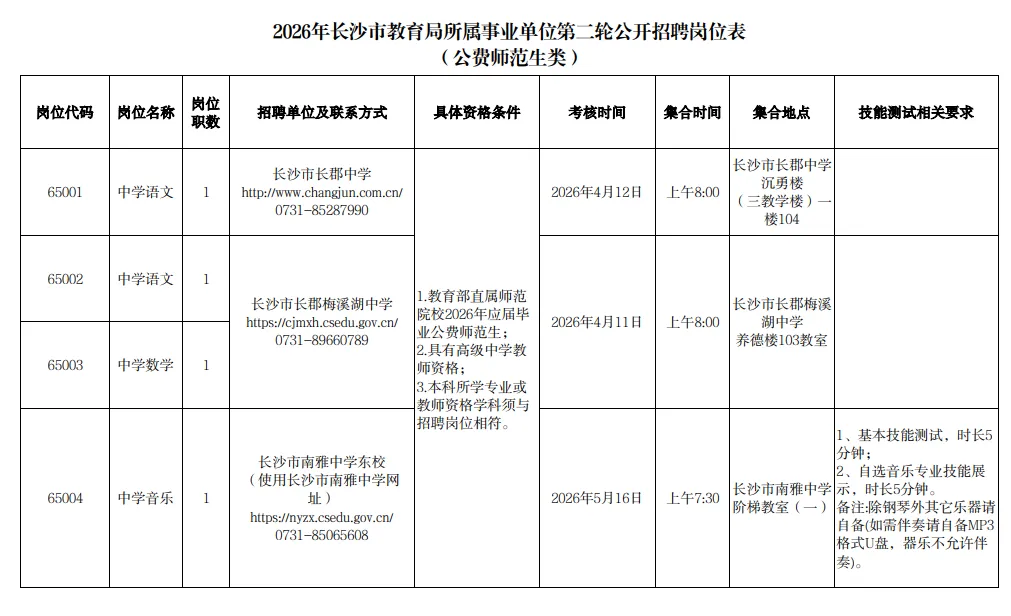 3.高校毕业研究生、骨干教师、学科竞赛教练和体育教练员岗位,报名人数与岗位职数的比例须达到3:1(含)方可开考。未达到开考比例的岗位,经长沙市人力资源和社会保障局批准,取消、核减相应岗位招聘计划或修改报名条件、延长报名时间,相关信息于2026年4月10日在长沙市人力资源和社会保障局官网、长沙市教育局官网教师招聘栏目公布。