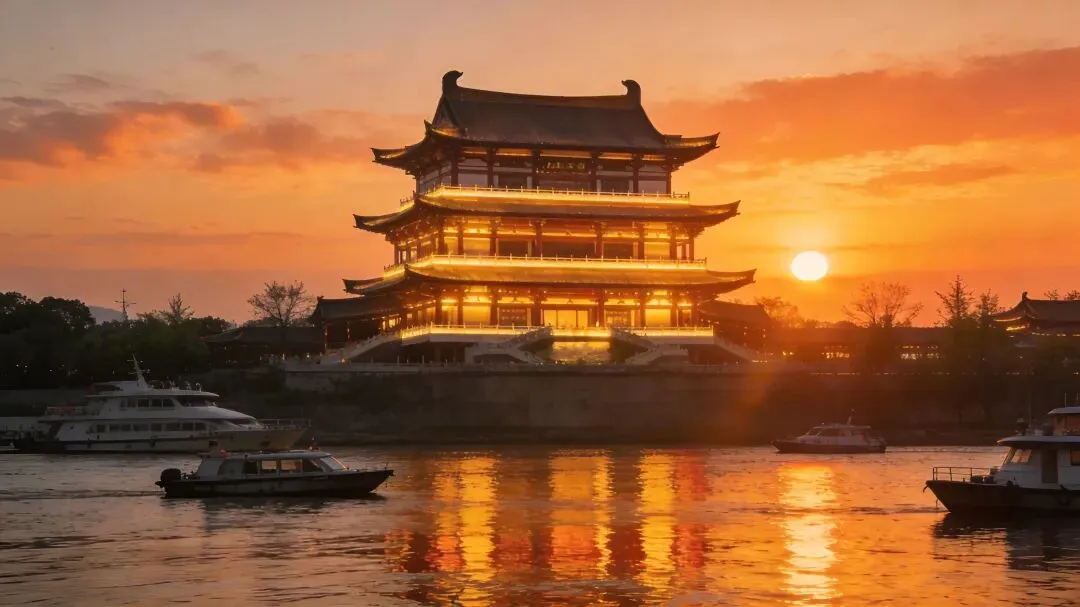 杜甫江阁夕阳西下,湘江夜景璀璨