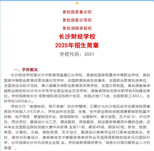 1.招生对象和报名条件:凡2025届应届合格初中毕业生均可报考我校,要求思想品德好,身心健康,无传染性疾病,无纹身,一般专业男身高165cm以上、女身高156cm以上。其中航空服务、艺术设计与制作、服装设计与工艺专业、美容美体艺术四个专业的报考要求,详见长沙财经学校2025年报考须知。