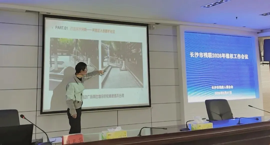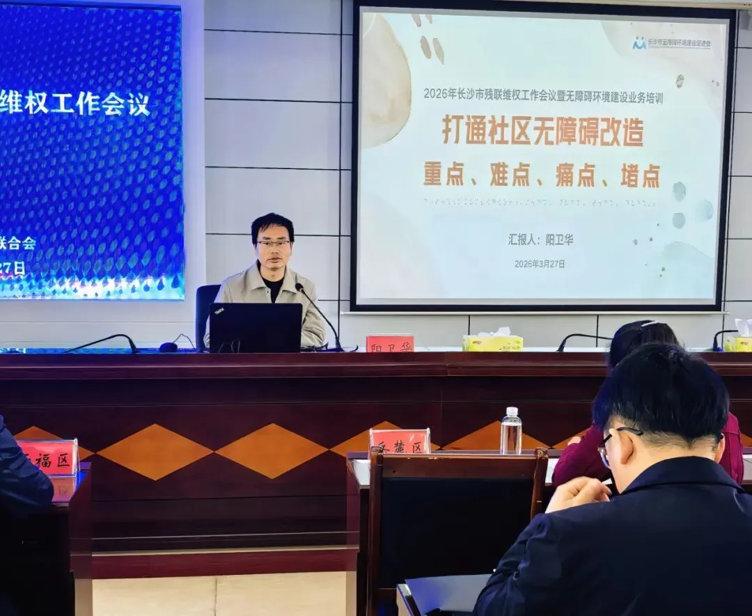为进一步提升长沙市无障碍改造的精细化、标准化水平,稳步推进“残疾人友好型城市”建设,3月27日,长沙市残疾人联合会召开2026年维权工作会议暨无障碍环境建设业务培训,市残联相关工作人员、各区县(市)残联分管维权工作副理事长、维权部负责人及无障碍改造施工方代表参加培训,我会高级工程师、执行秘书长阳卫华受邀作《打通社区无障碍改造“重点、难点、痛点、堵点”》主题授课。