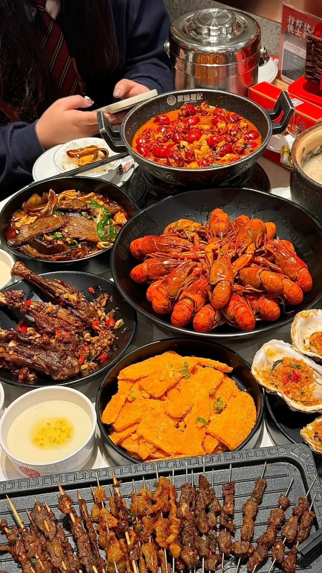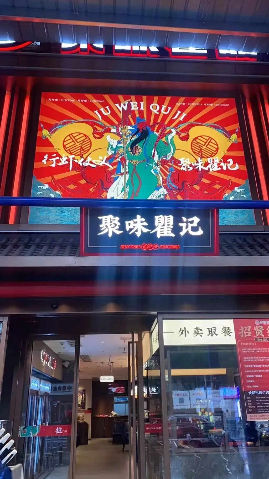 江湖义气内饰:店内大红立柱、复古灯笼、关公画像、毛笔字标语,处处透着“大口喝酒、大口吃虾”的豪气。开放式布局宽敞明亮,座位间距舒适,无论是兄弟撸串、家庭聚餐、情侣约会都超合适 。