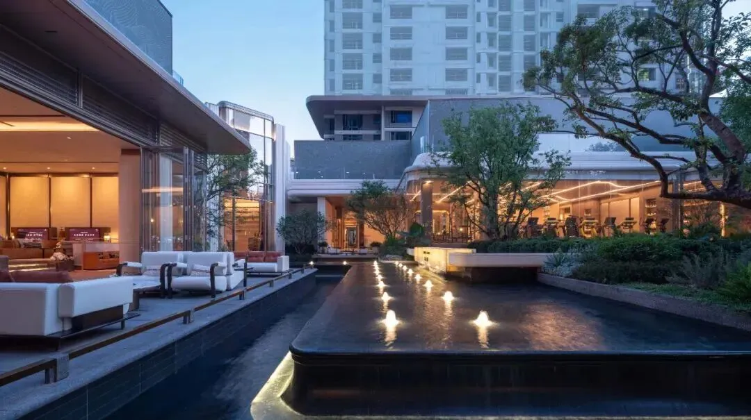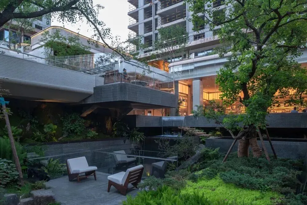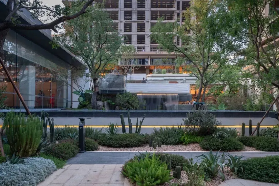 由于下沉庭院四周布置大面积的落地玻璃,相互借景,室内外景观交互感觉较好。从设计手法来看,室外主要采用镜水面,拓宽视野边界,不过还是那个问题,后期维护起来比较麻烦,考验物业真实水平。