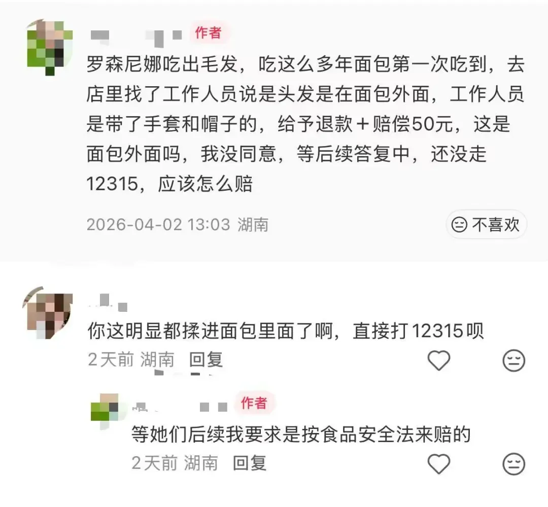 长沙消费者称在罗森尼娜买的面包中吃出毛发,拒绝了门店退款+50元赔偿的方案,门店回应.