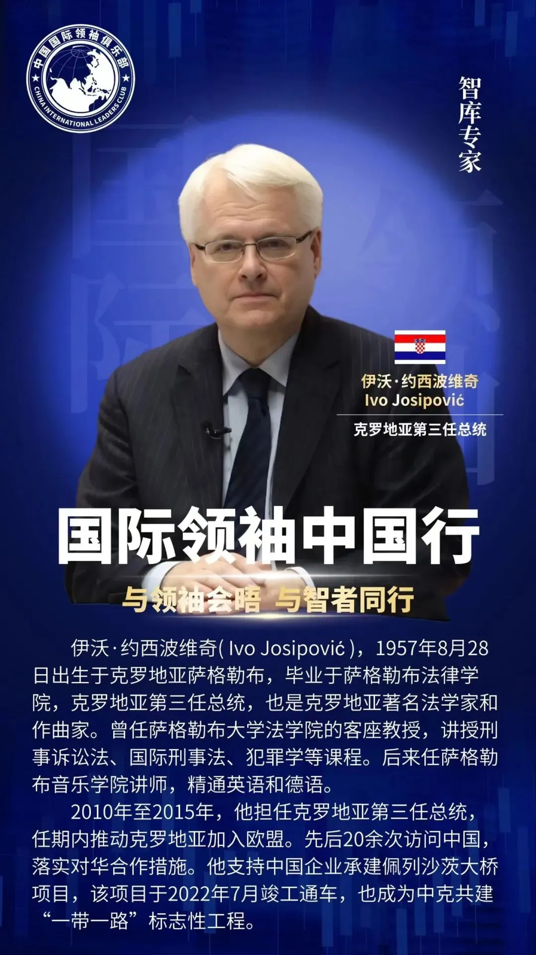 2026年4月20日,克罗地亚前总统交流论坛将在首都北京举办,届时克罗地亚第三任总统 伊沃·约西波维奇( Ivo Josipović )将出席活动。为中国企业家分享个人成长经历,进一步解读克罗地亚商业机遇和投资机会。