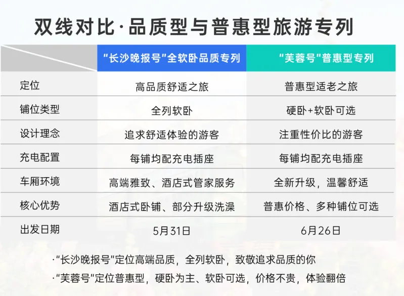 两趟专列车体均由广铁集团与湖南省旅游集团联合打造,线路由长沙晚报携手湖南温馨夕阳国际旅行社、湖南慢悠旅行文化传媒有限公司推出,致力打造具有长沙特色的高品质适老化旅游专列品牌。