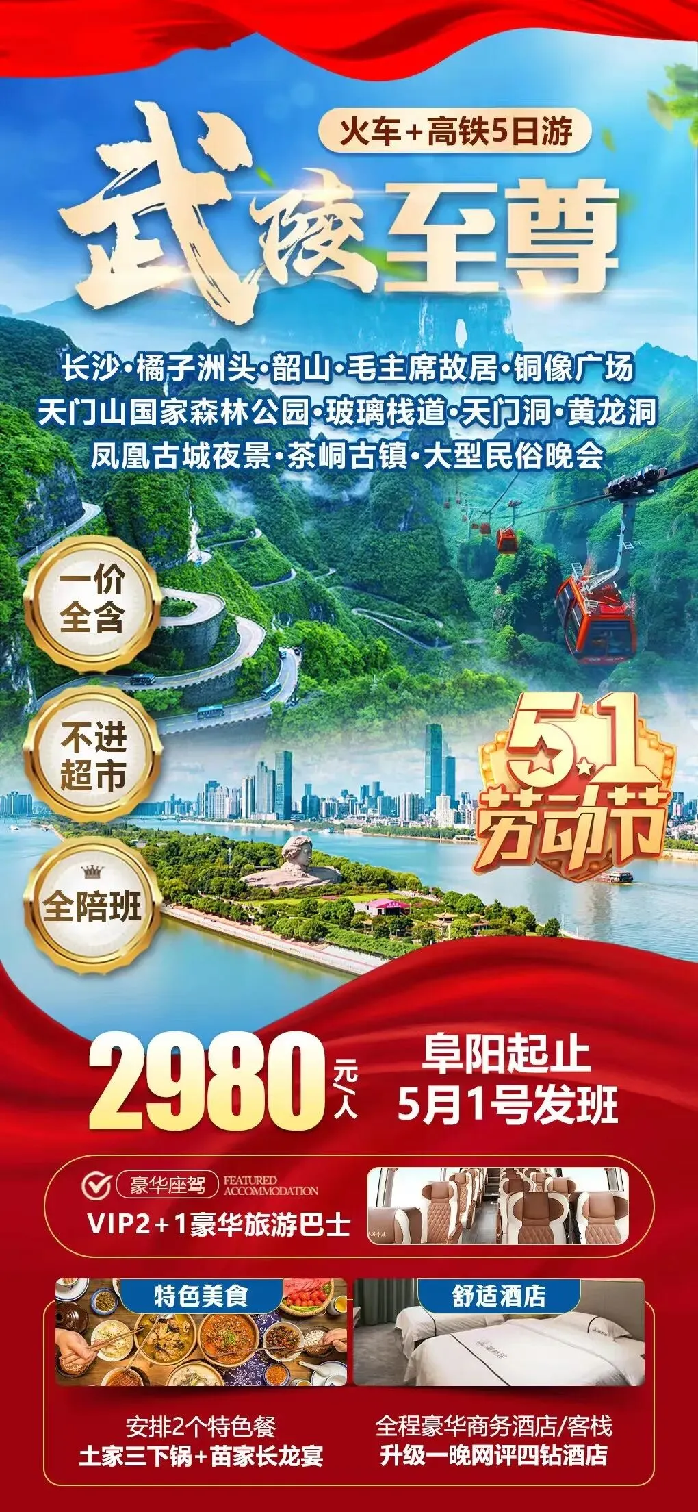 5.1阜阳出发|武陵至尊|长沙,韶山,张家界天门山,黄龙洞,凤凰古城火车+高铁5日游2980元!