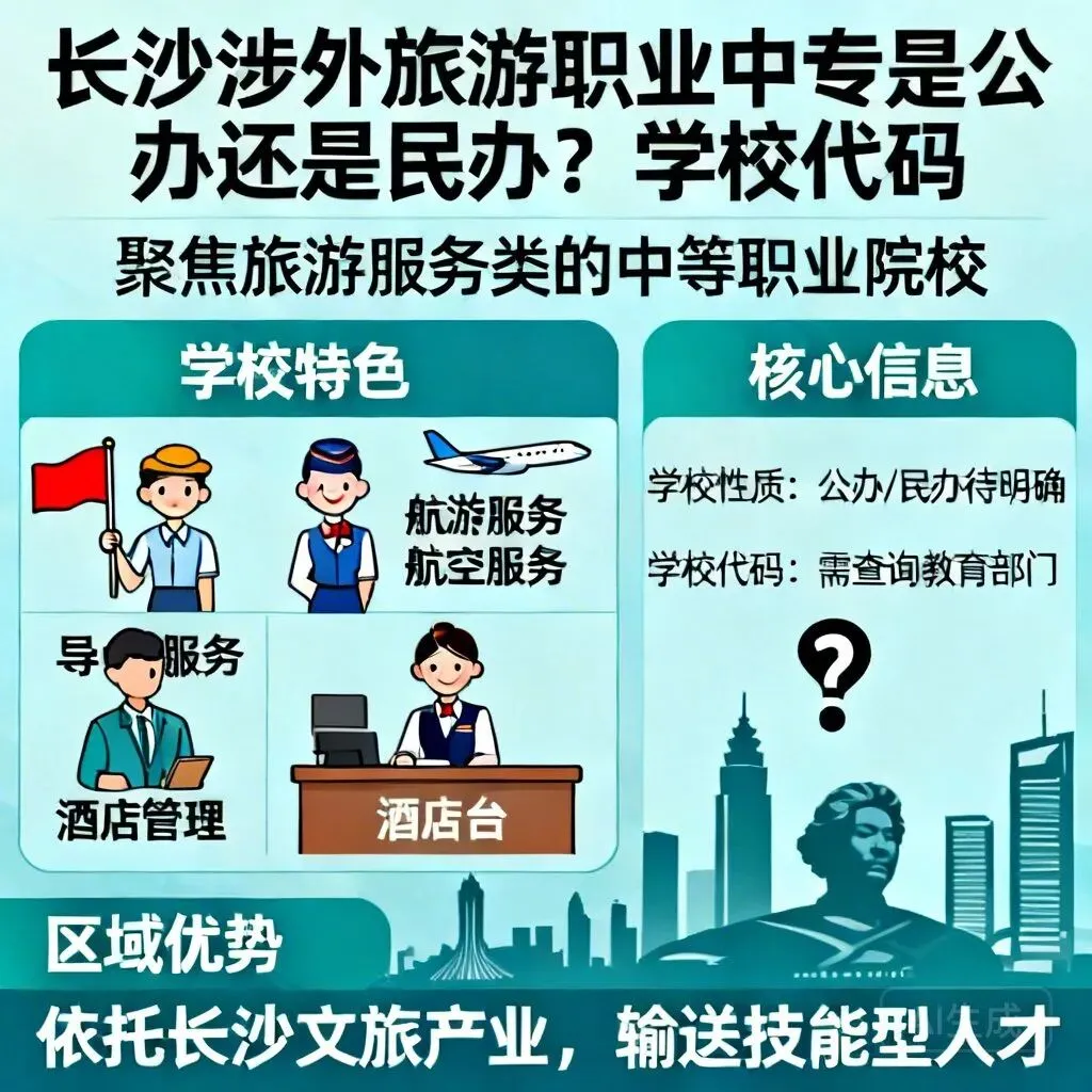 长沙涉外旅游职业中专是一所聚焦旅游服务类专业的中等职业院校,扎根长沙职教沃土,依托区域文旅产业优势,开设了导游服务、航空服务、酒店管理等特色专业,为行业输送了大量技能型人才。很多家长和学生在择校时,对其办学性质和学校代码尤为关注,这两个信息也是报考阶段的核心参考指标。