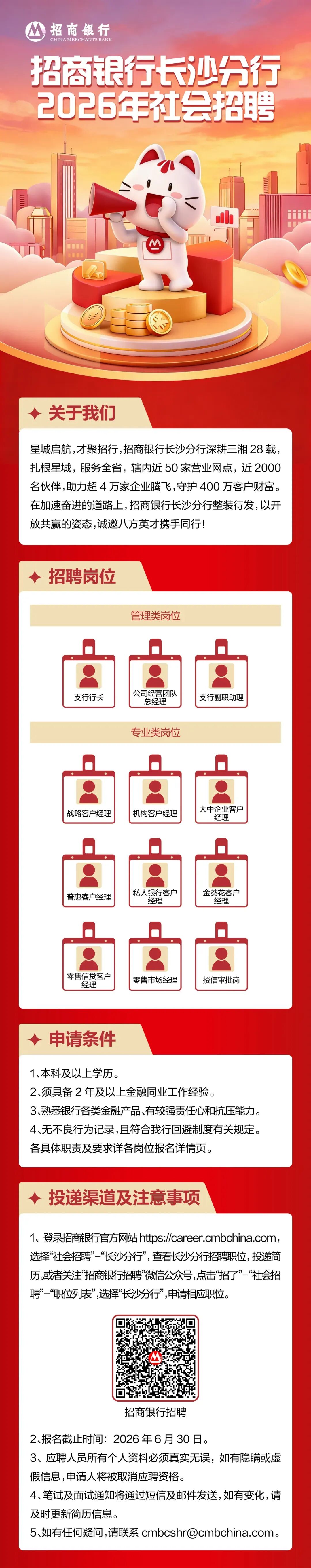 >招聘专栏 | 招商银行长沙分行2026社会招聘