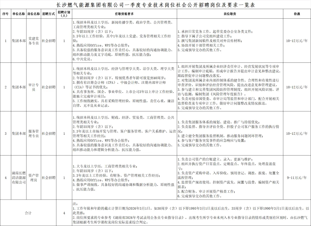 附件:长沙燃气能源集团2026年一季度专业技术岗位社会公开招聘岗位及要求一览表