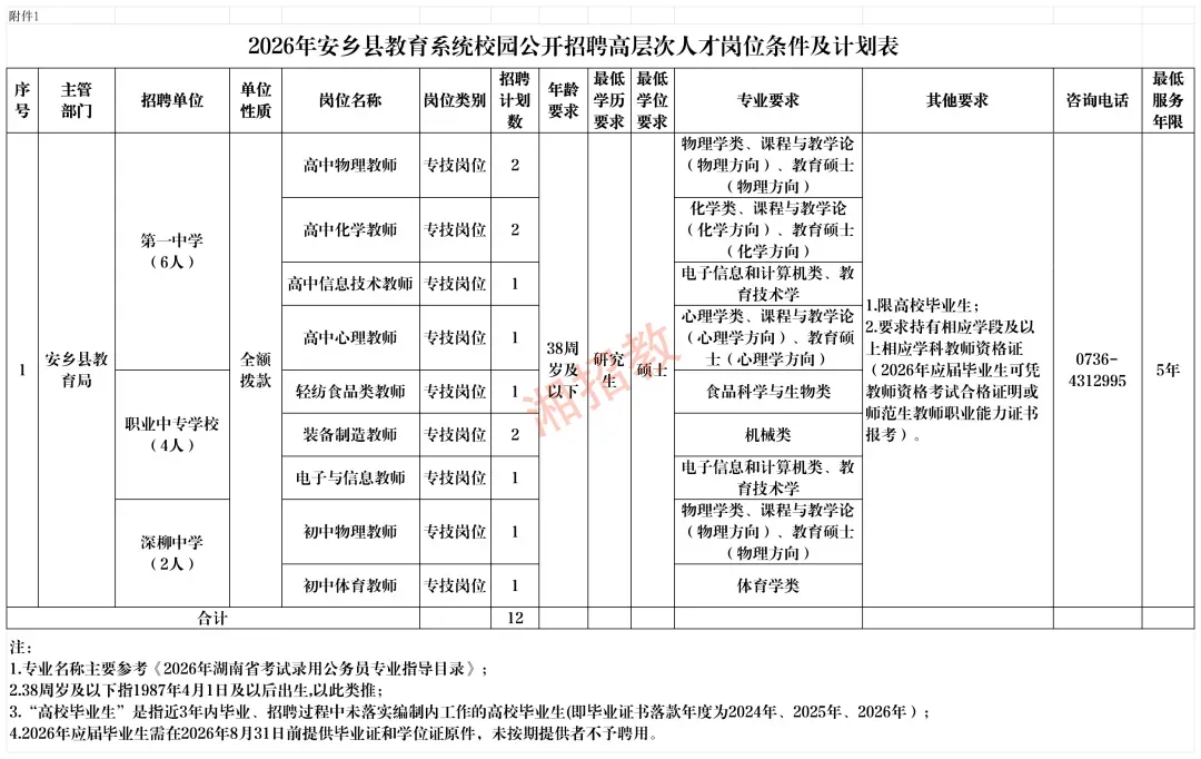 附件1:2026年安乡县教育系统校园公开招聘高层次人才岗位条件及计划表.xlsx