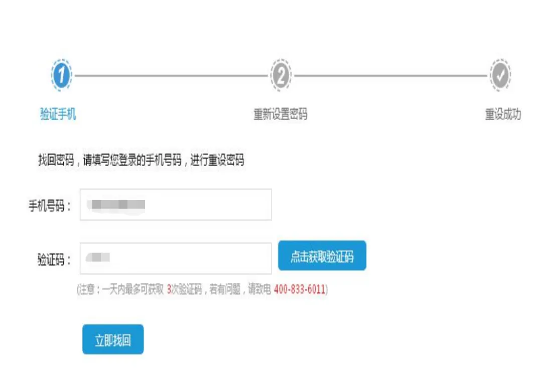 3. 找回密码: 密码遗忘后,可在登录页面右下方选择“忘记密码”,输入手机号码后以接收到的验证码来重置新密码。