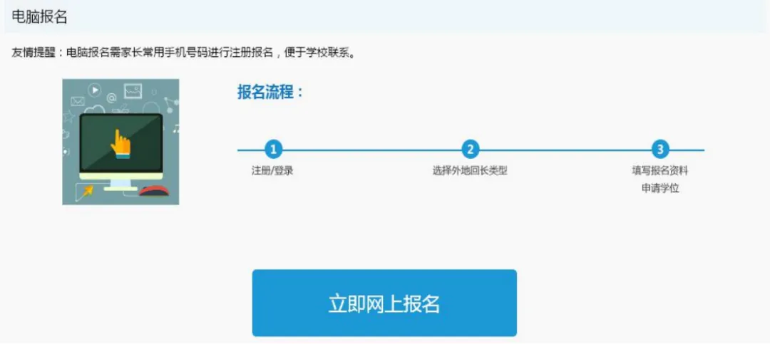 友情提醒:电脑报名需家长常用手机号码进行注册报名,便于学校联系。