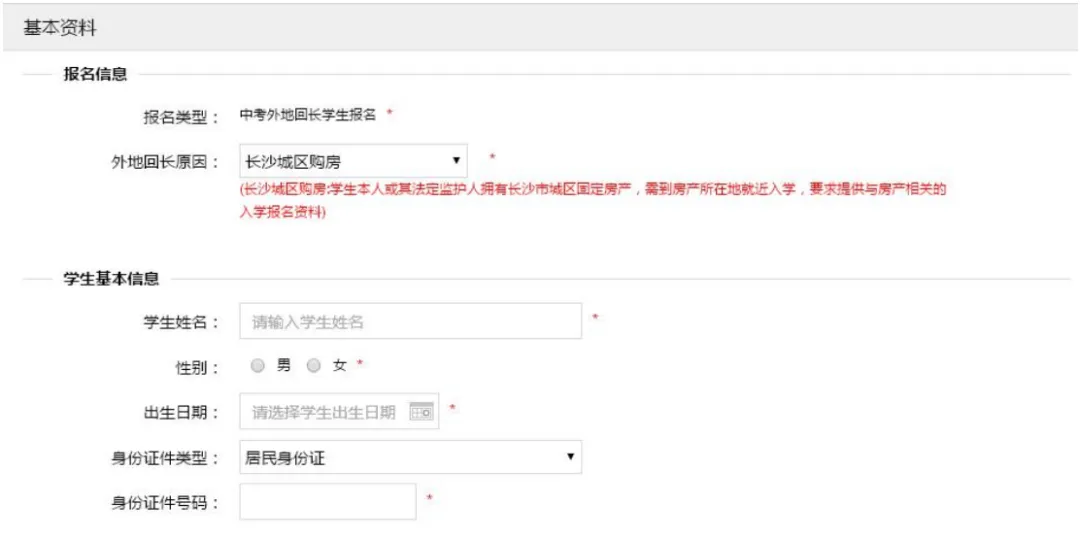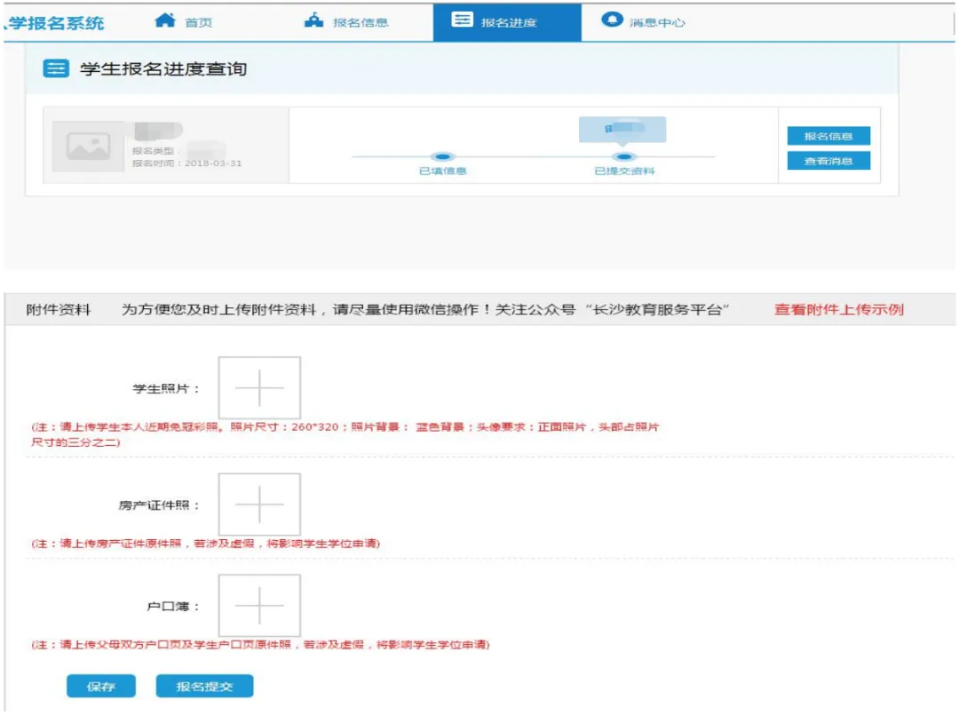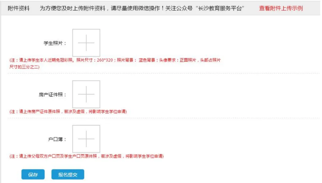 6. 填写学生报名信息 学生填报信息目前分为“报名信息”“学生基本资料”与“附件资料”。报名信息含学生外地回长的原因与入学区域;外地回长分为“在长沙城区购房”、“回户籍所在地”、“进程务工随迁子女”三大类。 学生基本资料含学生姓名、性别、出生年月、户口、家庭住址等;附件资料含房产信息、学生照片等(可点击“查看上传示例”按钮查看示例)。(温馨提示:填报资料时请提前准备好相关资料,可边填写边保存,避免因关机或其他因素导致填写的资料未及时存档!外地回长原因不同,上传资料略有不同。请如实上传,切勿填报虚假信息影响到小孩的入学!)