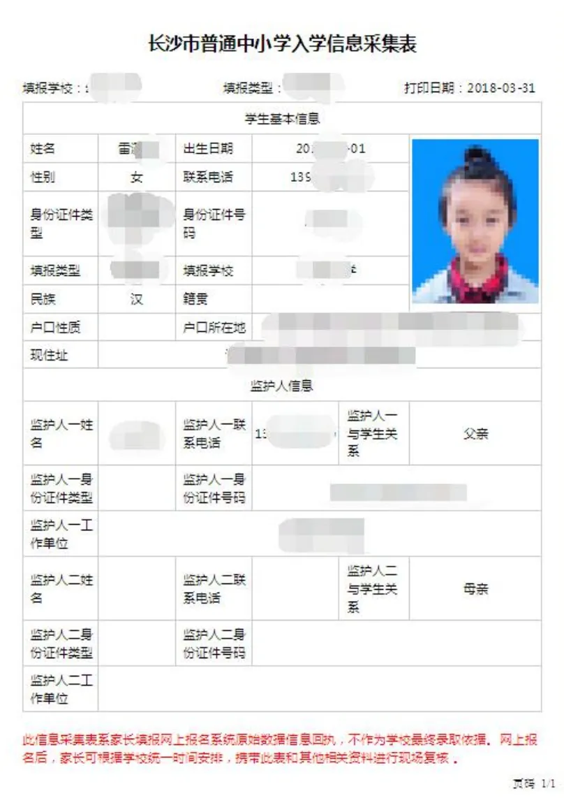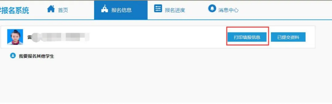 8. 打印信息采集表 提交报名信息后,点击“报名信息”,点击“打印填报信息”,打印“长沙市普通中小学入学信息采集表”。此信息采集表系家长填报长沙市普通中小学入学报名系统采集数据,不作为学校最终录取依据,家长可携带此表和其他相关资料到学校现场复核。