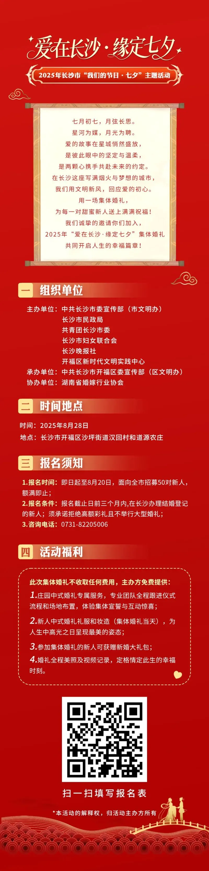 此次活动由长沙市委宣传部(市文明办)、市民政局、团市委、市妇联和开福区新时代文明实践中心主办,开福区委宣传部(区文明办)承办,长沙晚报社协办。即日起至8月20日,面向全市招募50对新人,5月20日至8月20日在长沙办理结婚登记的新人均可报名,须承诺拒绝高额彩礼且不举行大型婚礼。同时,面向全市招募伴娘、伴郎至少各10位(必须是在长沙工作的单身青年),组成“十全十美”伴娘、伴郎团。有意向者可拨打0731—82205006咨询、报名,也可扫描海报下方的二维码报名。