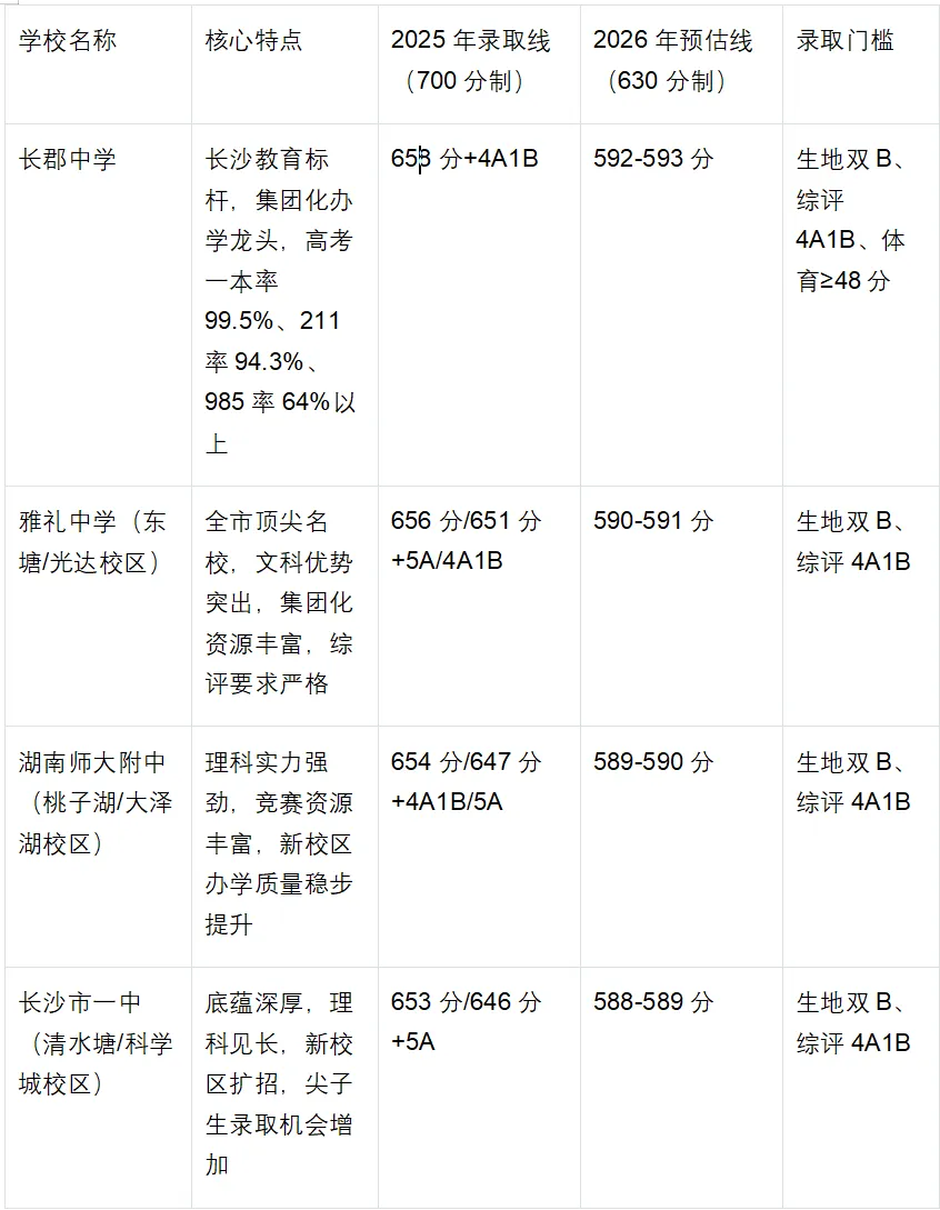 核心学校(含2026年预估线):长沙外国语学校(555-558分)、长铁一中(552-555分)、市十五中(550-552分)、地质中学(548-550分)、周南实验(545-548分)、长郡湘府(543-545分)、东雅中学(540-543分)。