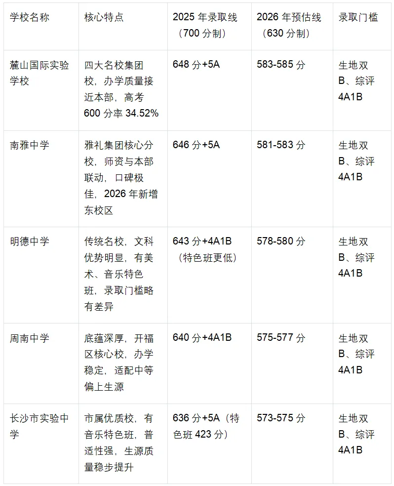 核心学校(含2026年预估线):长郡梅溪湖(568-570分)、师大梅溪湖(566-568分)、雅礼洋湖(565-567分)、长郡滨江(565-567分)、雅礼实验(563-565分)、长郡双语(560-562分)、师梅(560-562分)、明德华兴(558-560分)。