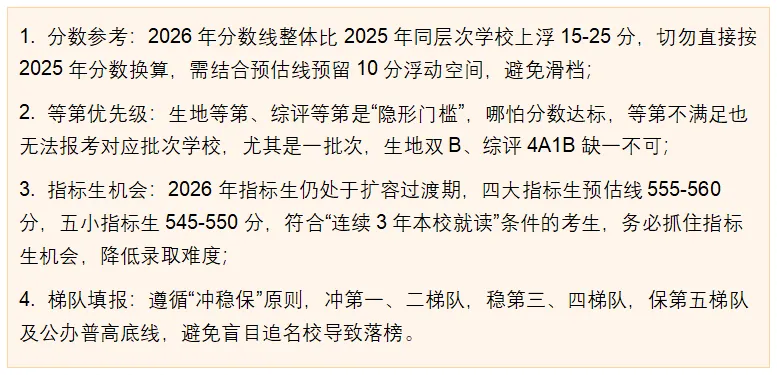 •科目变化:体育分值从40分提升至50分,生地不计入总分,仅以A/B/C/D等第作为录取入围依据(一批次需双B及以上);