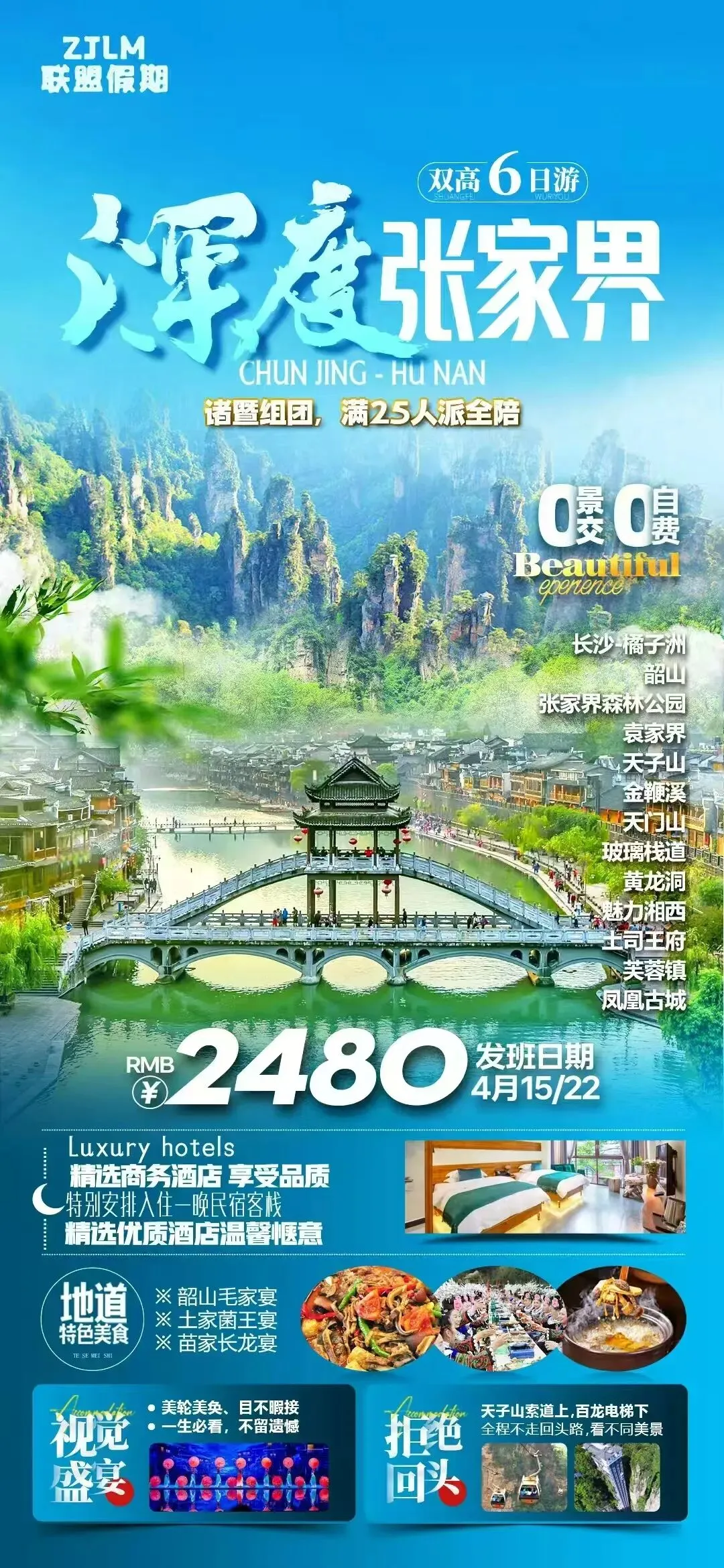 2、张家界以山为主,为方便在山区游览,请穿平跟鞋,建议不穿裙子,自带雨具、太阳帽、防蚊水等物品用餐:早/晚餐 住宿:武陵源