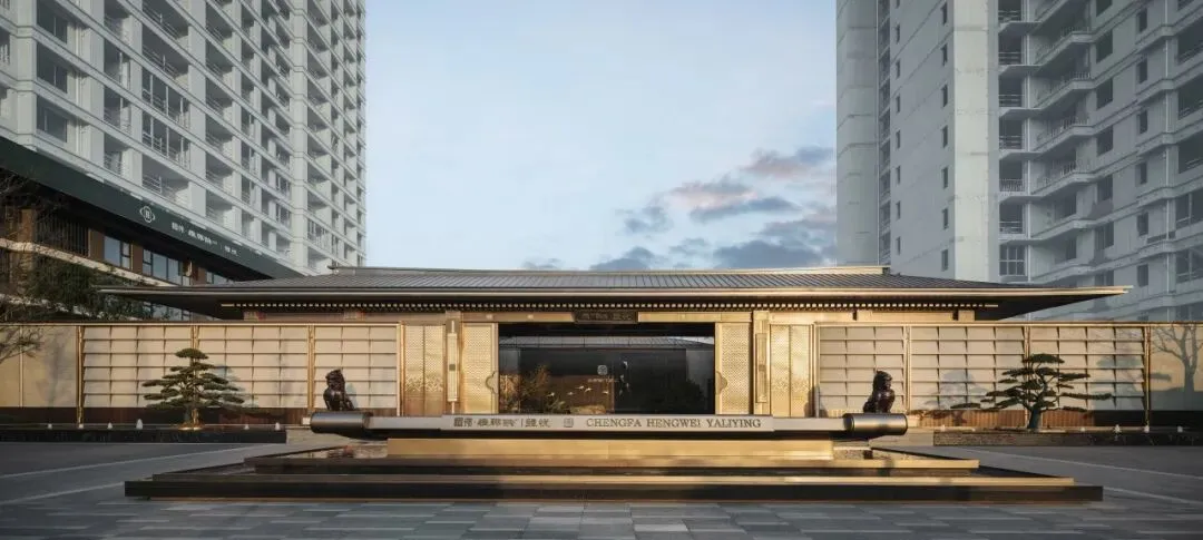 60米宽礼序大门峙立中轴,门头传承唐代“宅以门户为冠带”之礼,形如盛唐官帽。