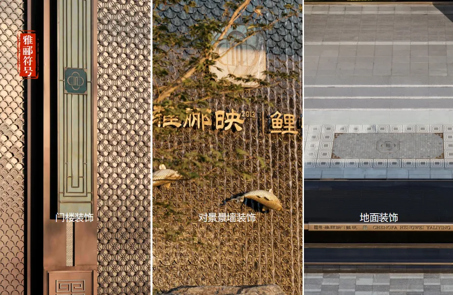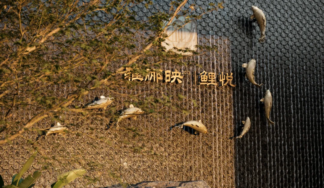 Nine-tailed koi fish leap vividly on the wall, inspired by the Painting of Carp Leaping Over the Dragon Gate. Their scales glisten brightly, echoing the scroll-like waterscape outside the gate—offering both heartfelt wishes of good fortune to the residents and a perfect interpretation of the project’s name, “Li Yue (Joy of the Carp).”