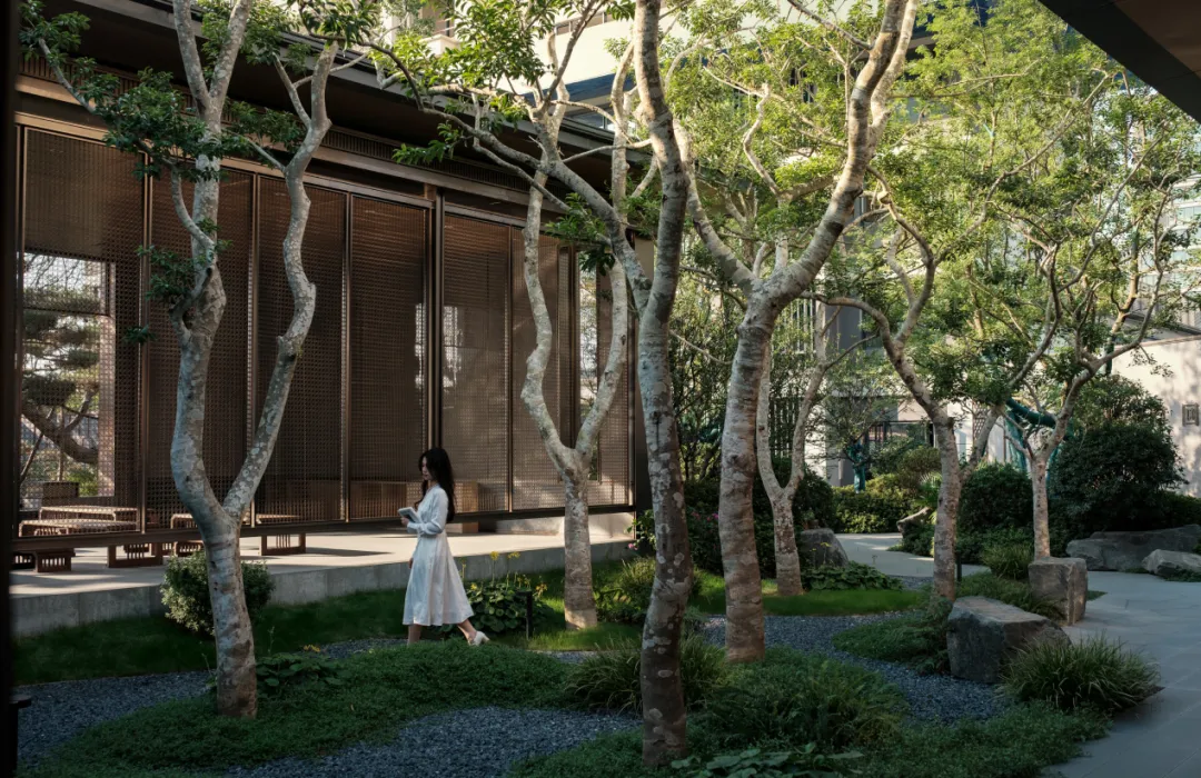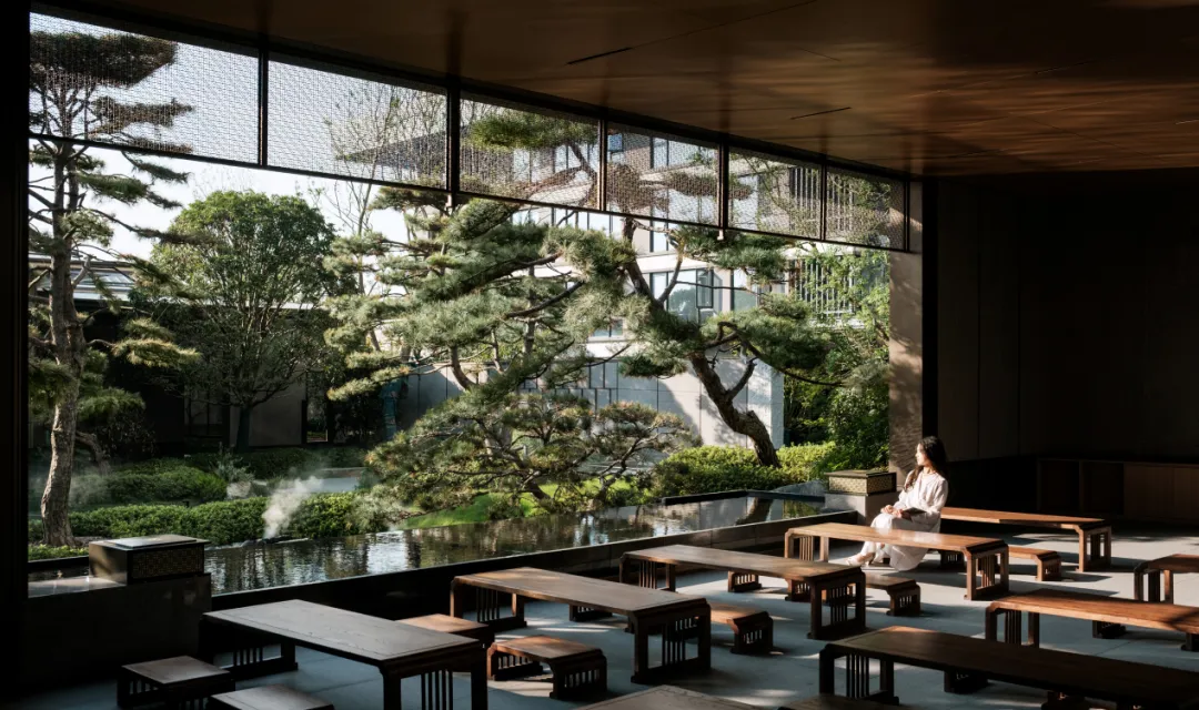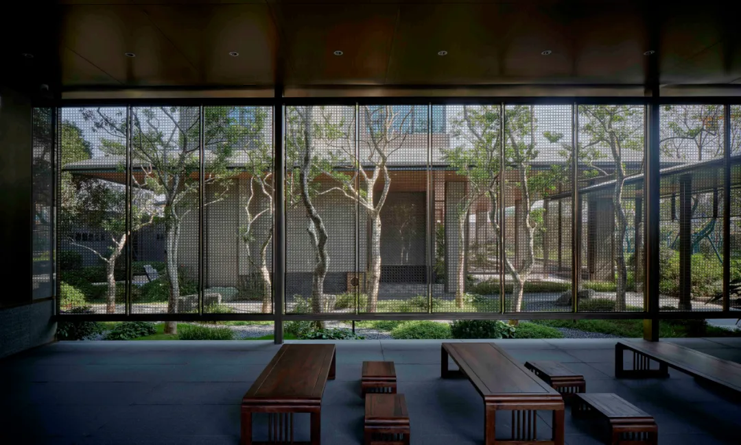 回形游廊围合庭院,九棵老松苍劲成林,构建静谧雅致的核心景观区。