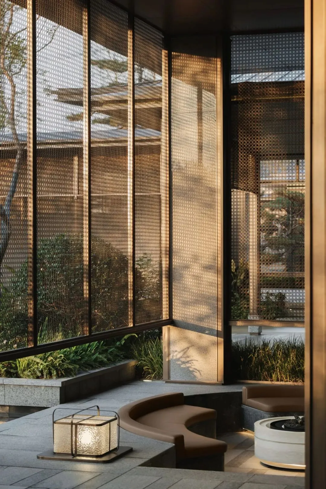 游廊低饱和色彩,仿木纹顶棚与金属网帘交织光影,精选鸡爪槭点缀其间,24小时无惧风雨,方寸庭园自有雅韵。