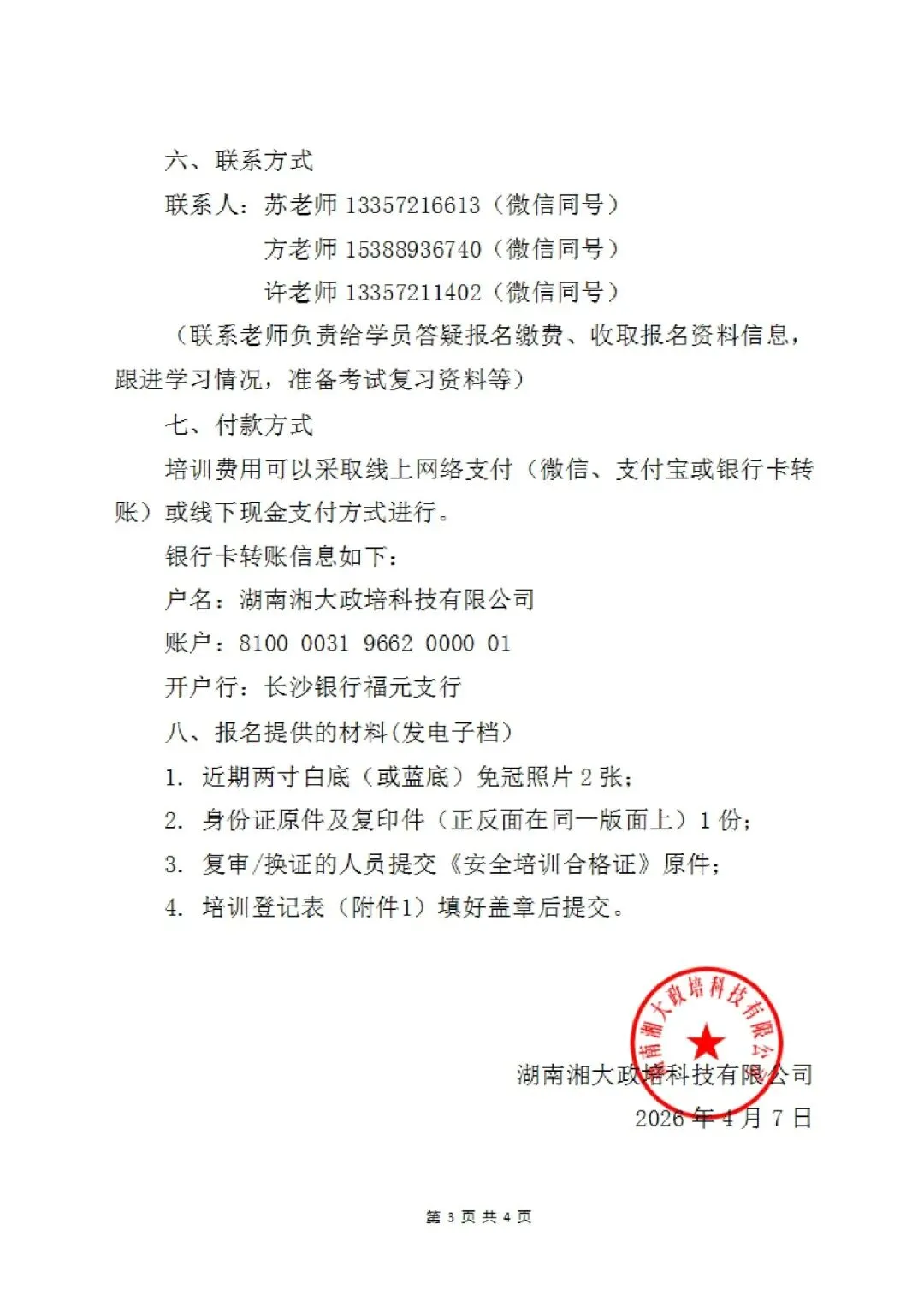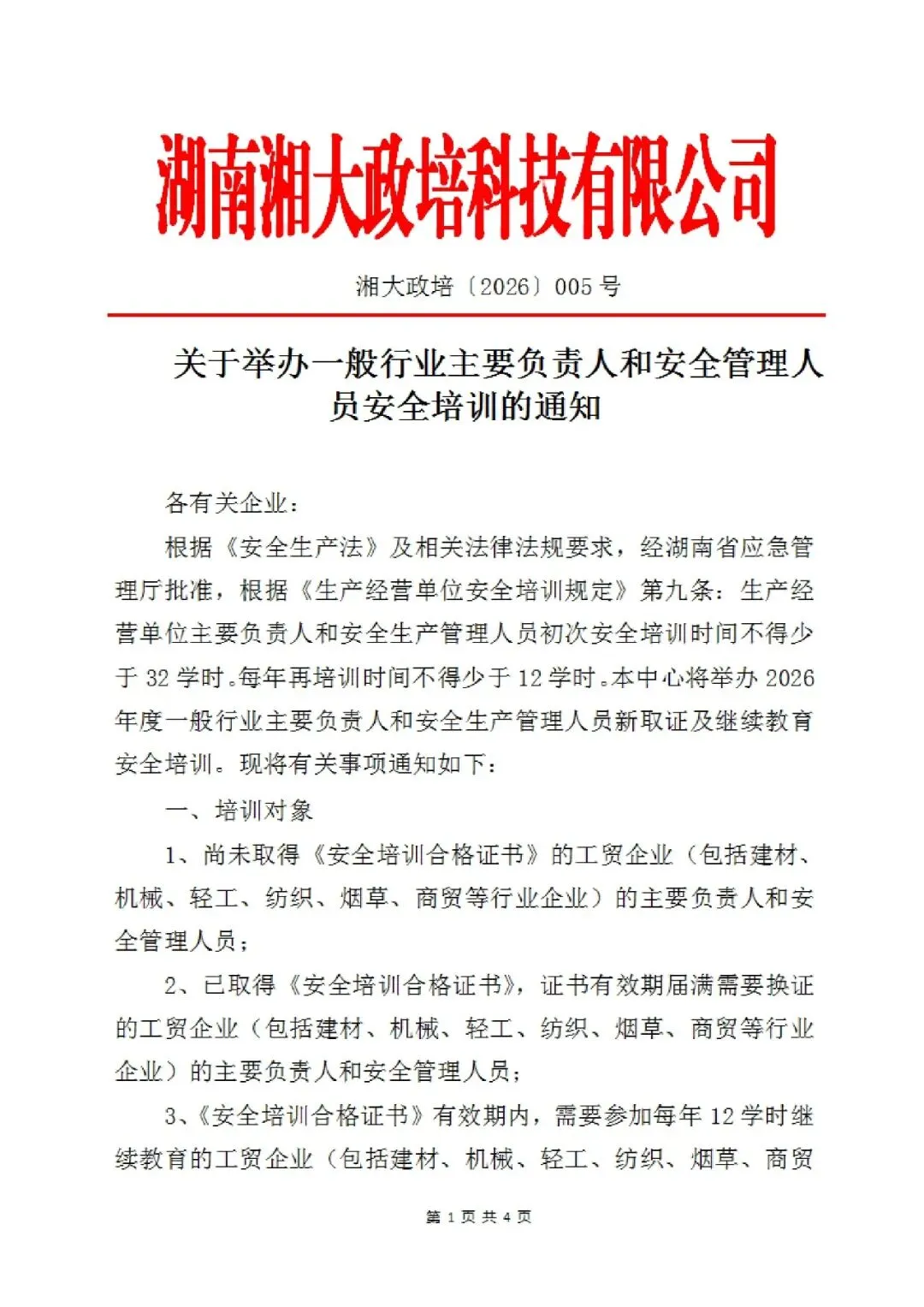 根据《中华人民共和国安全生产法》、《湖南省生产经营单位安全生产主体责任规定》、《生产经营单位安全培训规定》等文件精神,为优化营商环境,提升服务水平,建立建全全员安全生产责任,湖南湘大政培科技有限公司定于4月16日,集中开展普通类生产经营单位主要负责人和安全管理人员安全培训合格证书培训班,现正式启动报名!