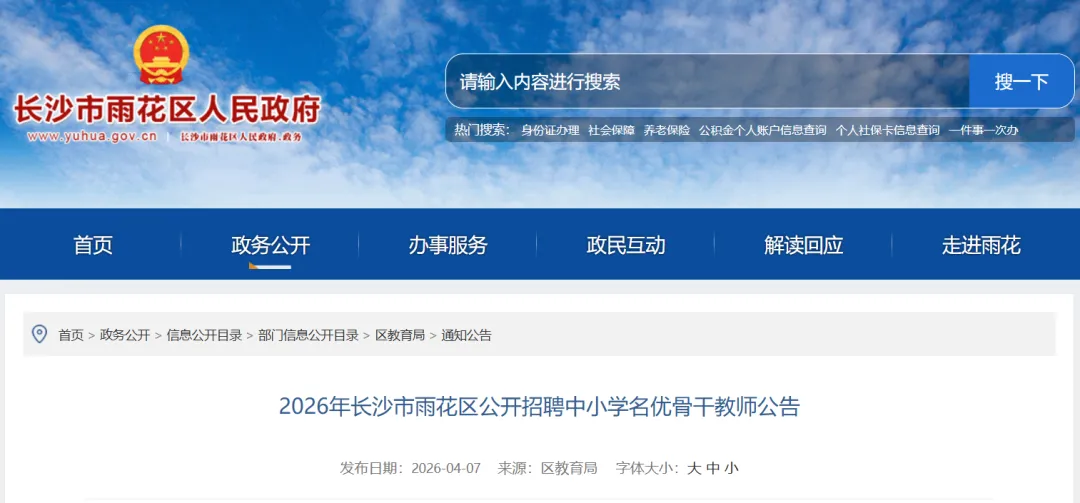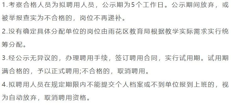招聘公告、拟聘用人员公示通过长沙市雨花区人力资源和社会保障局、长沙市雨花区教育局官方网站(http://www.yuhua.gov.cn/zwgk97/xxgkml/384213/384032/bm.html、http://www.yuhua.gov.cn/zwgk97/xxgkml/384213/384183/384193/)发布。其他各个程序的工作安排、通知,通过长沙市雨花区教育局官方网站、“雨花教育”官方微信公众号发布,请报考人员注意查看。未按要求参加的,视为自行弃权。
