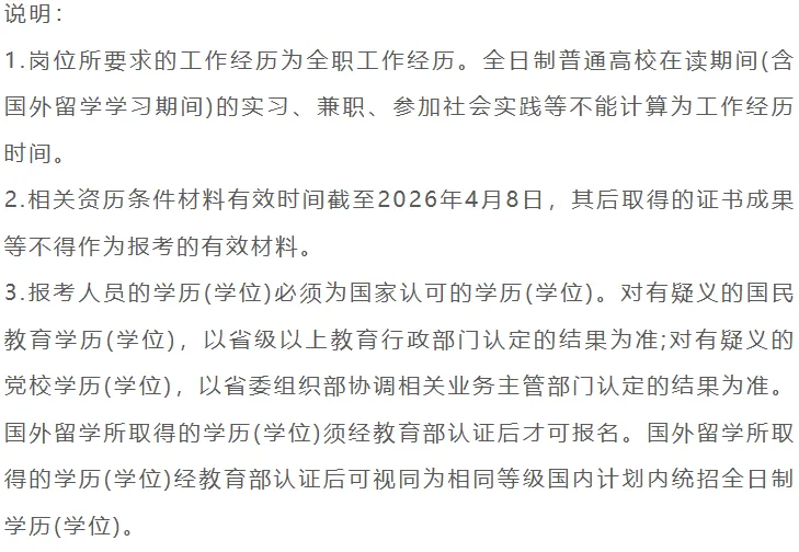 1.本次招聘考试实行网上缴费。通过网上资格初审的报考人员需在规定时间内完成缴费,缴费时间为2026年4月15日9:00-4月16日20:00,考务费为100元/人,缴费成功即报名成功。未在规定时间缴费者,视为自动放弃报考资格。放弃考试或未入围后续环节的报考人员,考务费不予退还。