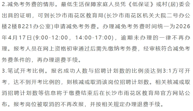 笔试暂定于2026年4月26日进行。详见长沙市雨花区教育局官方网站和“雨花教育”官方微信公众号的公告,或登录报名系统查看。