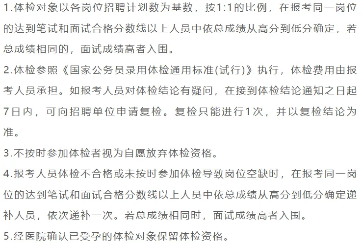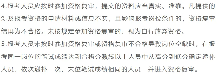 1.资格复审入围比例。报考人员需参加资格复审,在报考同一岗位的笔试合格分数线以上的人员中根据笔试成绩由高分到低分确定,按招聘计划数3:1的比例确定入围名单,其中招聘计划在10个及以上的岗位按照与招聘计划数2:1的比例确定。若各岗位比例控制内末位笔试成绩相同的均进入资格复审。