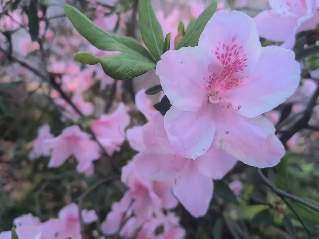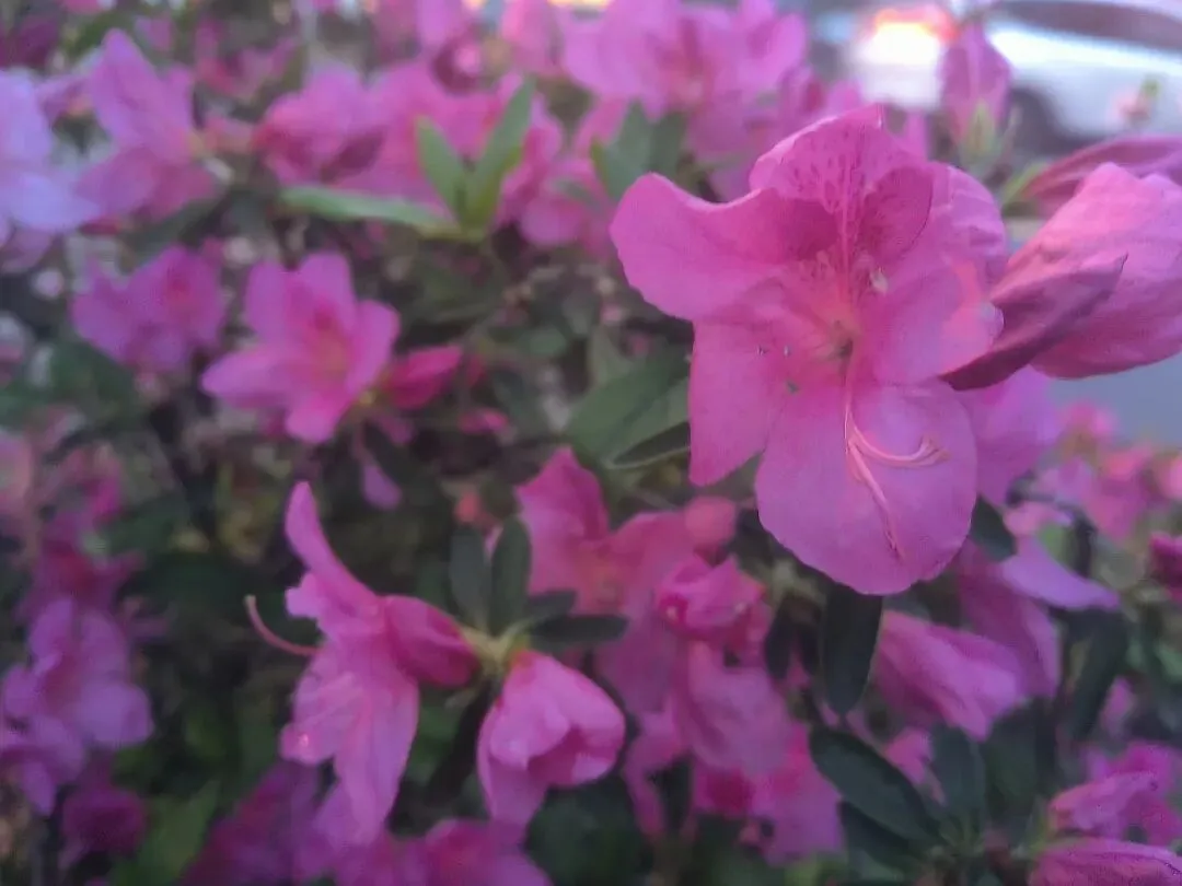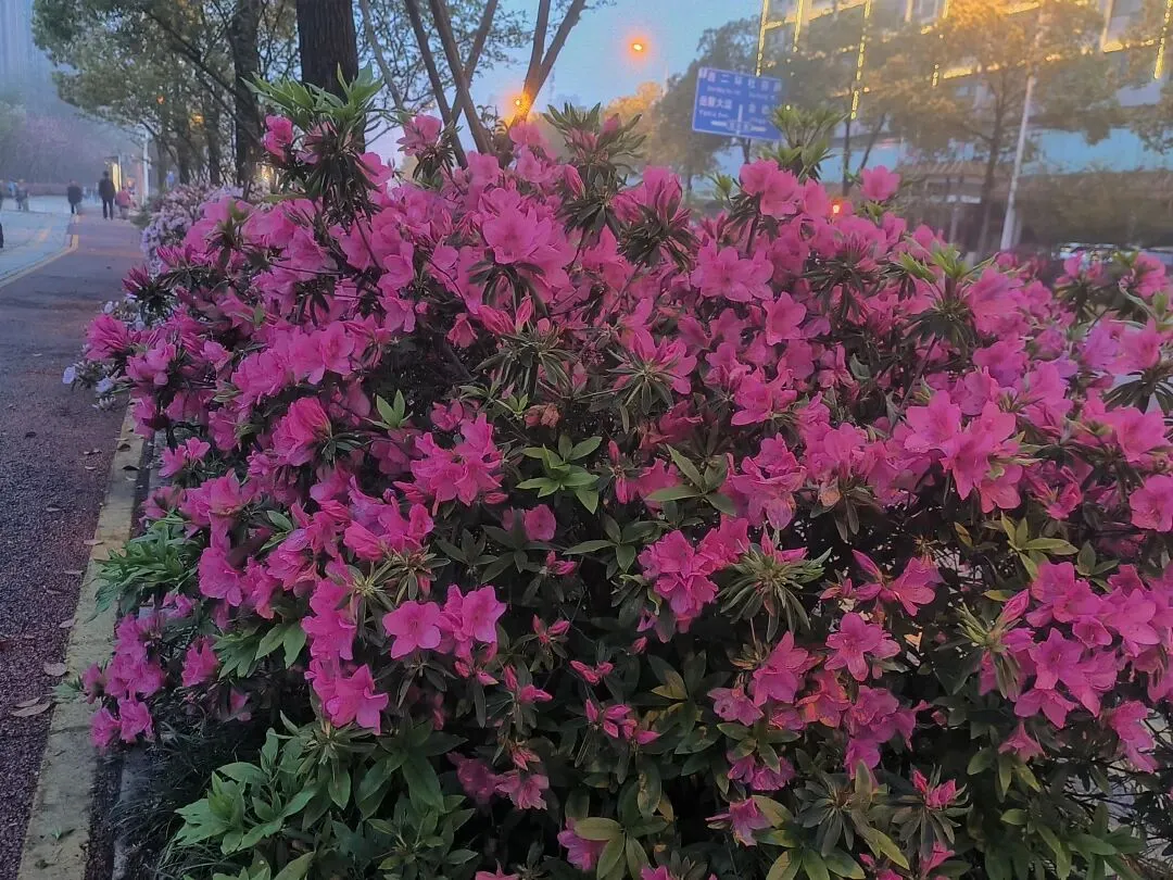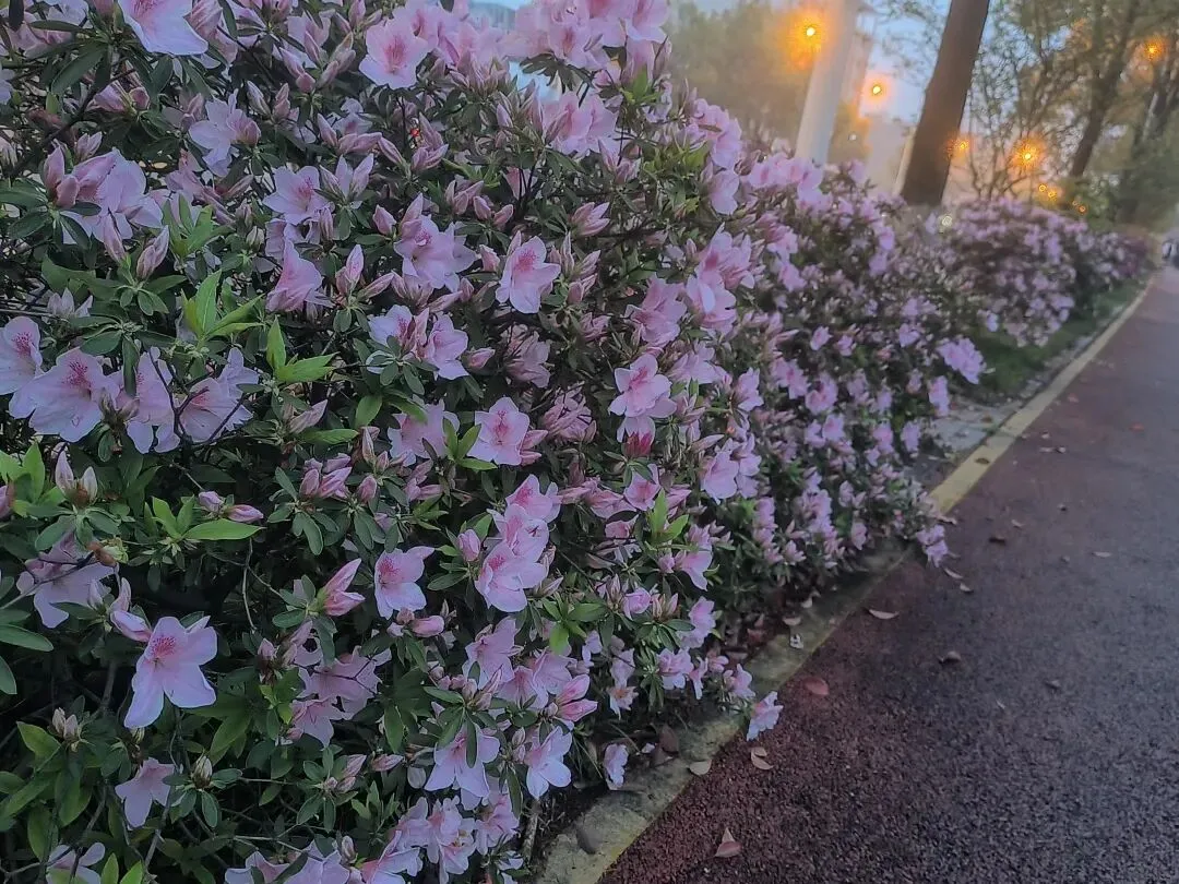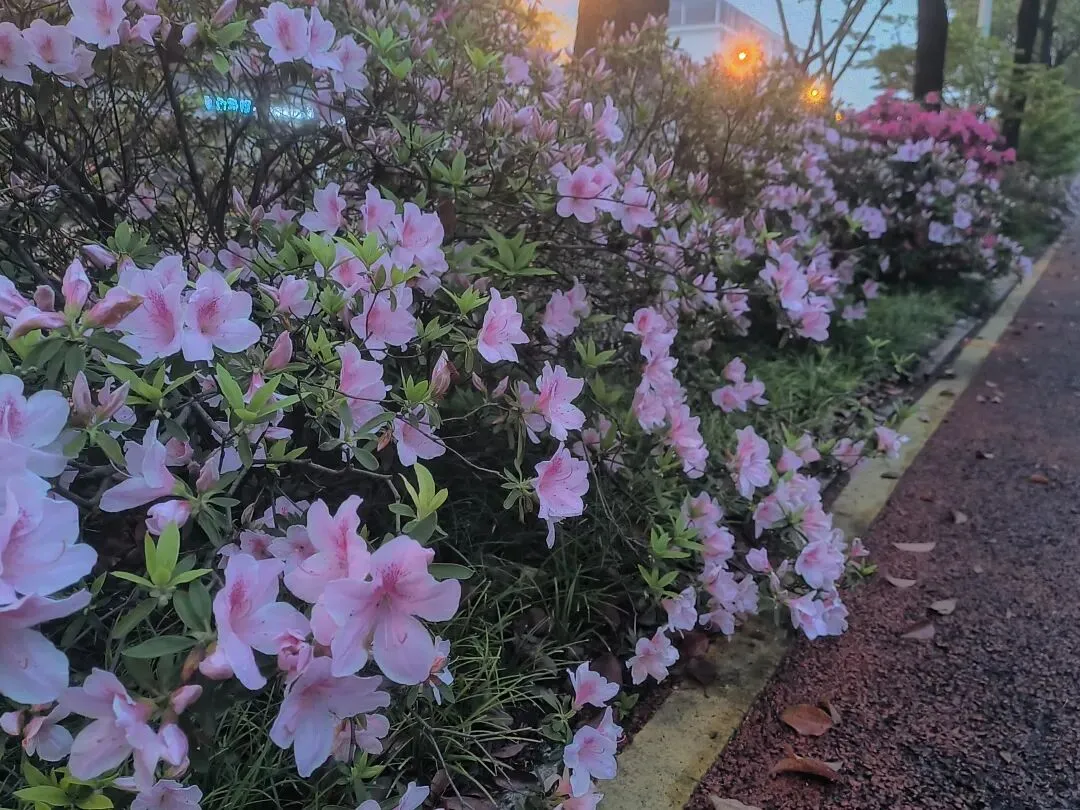 2. 夜景绝绝子:夜晚的杜鹃路自带氛围感,暖黄路灯洒在花瓣上,搭配相机夜景模式,虚化背景后花朵轮廓更清晰,粉红花色在灯光下温柔又高级,还能捕捉到花瓣上的细碎光斑和水珠,比白天更有故事感。
