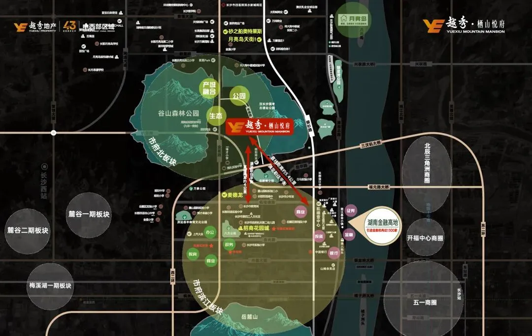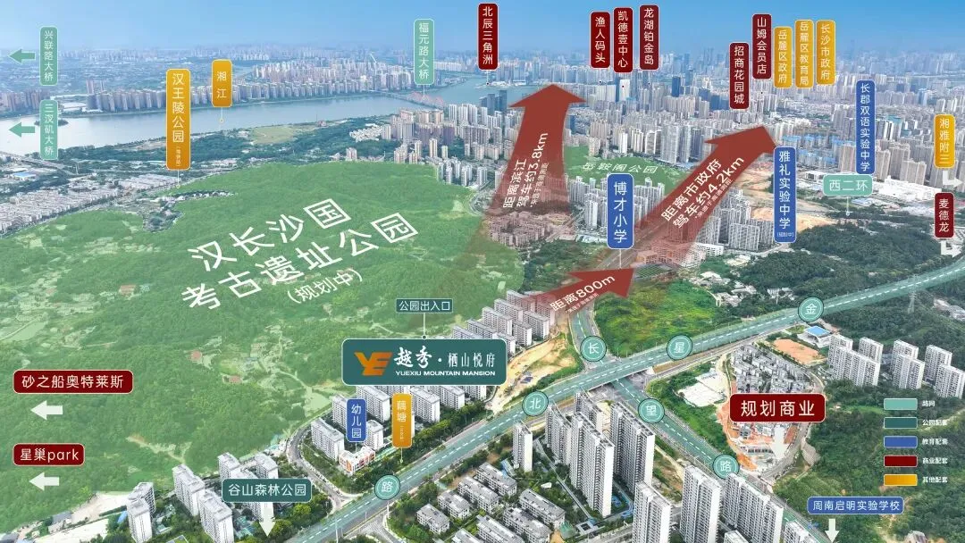 商业:3 公里内砂之船奥特莱斯、麦德龙、步步高三大商圈环绕,周末逛街、聚餐、看电影,一脚油门就到,不用跨区奔波;生态:背靠 6400 亩谷山森林公园,旁边就是汉长沙国考古遗址公园,相当于把家安在 “城市绿肺” 里。早上推开窗是满山绿意,傍晚散步能吸负氧离子,周末带孩子爬山、露营,不用跑远郊,家门口就是诗和远方;交通:金星路、长望路、西二环三大主干道交汇,自驾四通八达;周边公交路线密集,未来还有规划地铁覆盖,不管是自驾还是公共交通,都超方便。别人的改善是 “在繁华里挤着住”,要么 “在静谧里偏着住”,而越秀栖山悦府是出则繁华入则宁静——5 分钟享主城配套,10 分钟入谷山静谧,不用在 “地段” 和 “环境” 之间做选择题,这才是改善该有的区位!