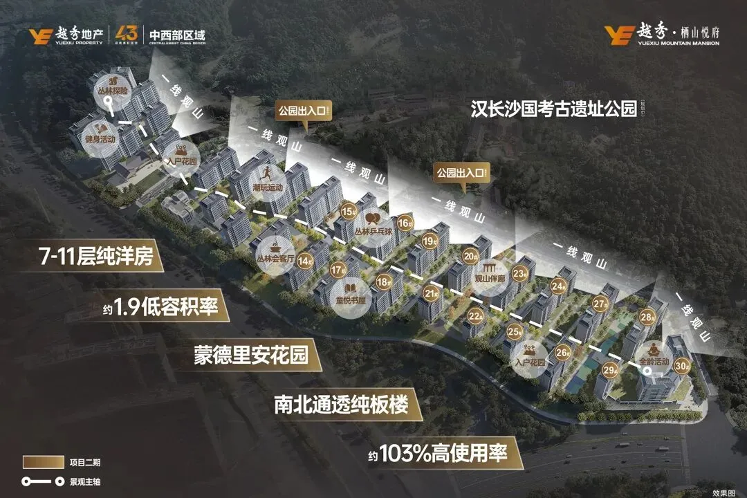 纯洋房社区,无高层遮挡:整个小区 30 栋楼,全是 7-11 层的真洋房,没有一栋高层、超高层。不像那些 “高低配” 小区,洋房被高层围得密不透风,这里户户无遮挡,视野、采光、通风全拉满;超低容积率,主城罕见:长沙主城小区平均容积率动不动 4.0+,挤得像 “鸽子笼”,而栖山悦府低容积率,绿化率约 30%。楼间距超宽,小区里到处是园林、绿地、休闲区,人均空间大到离谱,散步、遛娃不用人挤人,安静又私密;纯板楼,南北通透:拒绝高层拥挤,纯板楼结构,户户南北通透、全明采光,阳光、自然风直接灌进屋里,每个房间都亮堂堂,梅雨季也不潮湿。再聊最实在的 ——得房率 103%,“负公摊” 真良心!现在长沙的高层、小高层,公摊普遍 20%-25%,买 100㎡实际只能用 75㎡,花冤枉钱买 “空气”。而越秀栖山悦府,得房率直接干到 103%!买 129㎡的房子,实际使用面积比产权面积还大,每一分钱都花在刀刃上。户型更是没得挑,全是改善爆款,覆盖 129-195㎡全周期需求: