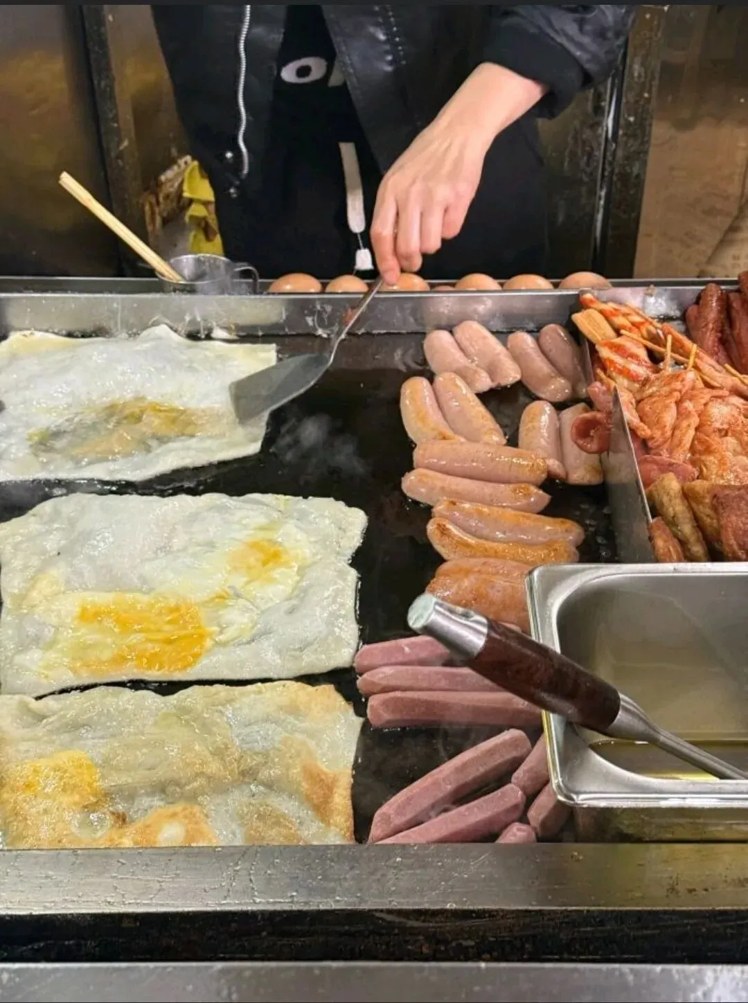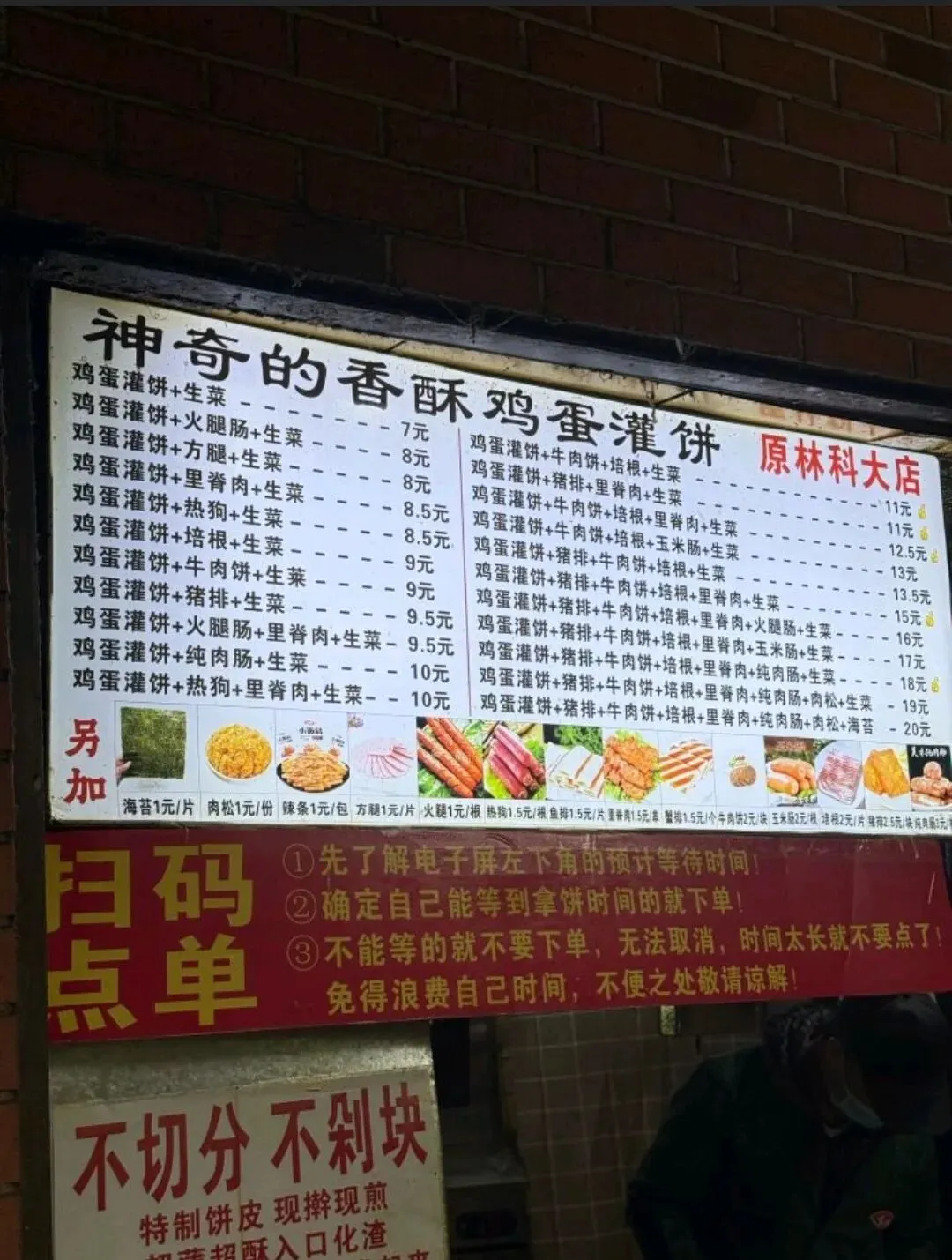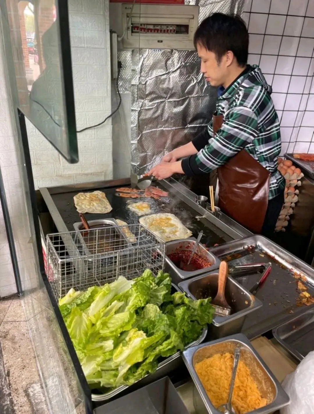 最绝的是配料自由,火腿、里脊肉、牛肉饼、玉米肠…十几种配菜随便加,再配上清爽的黄瓜和生菜,中和了油腻,最后刷上秘制酱料和长沙特色油辣子,咸香、微辣、酥脆三重口感交织。