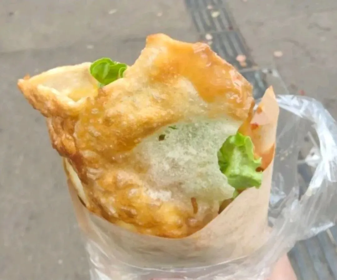 饼皮擀得薄如蝉翼,在铁板上煎得金黄酥脆,边缘微微翘起,带着恰到好处的焦香。老板手法一绝,面饼鼓起小泡时,快速戳开小口,蛋液顺着缝隙灌进去,蛋液和饼皮完美融合,每一口都能吃到蛋香。