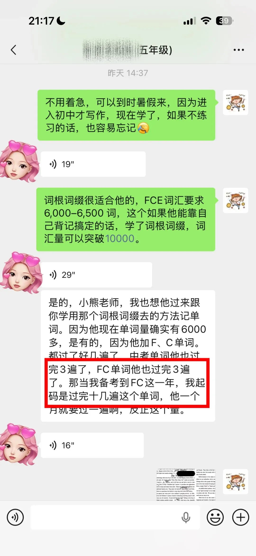 就说这个五年级的孩子,每天雷打不动背100个单词,FCE要求的6000-6500个单词,他已经刷过三遍了。五年级啊,三遍。这种执行力真的不是一般家庭能做到的。