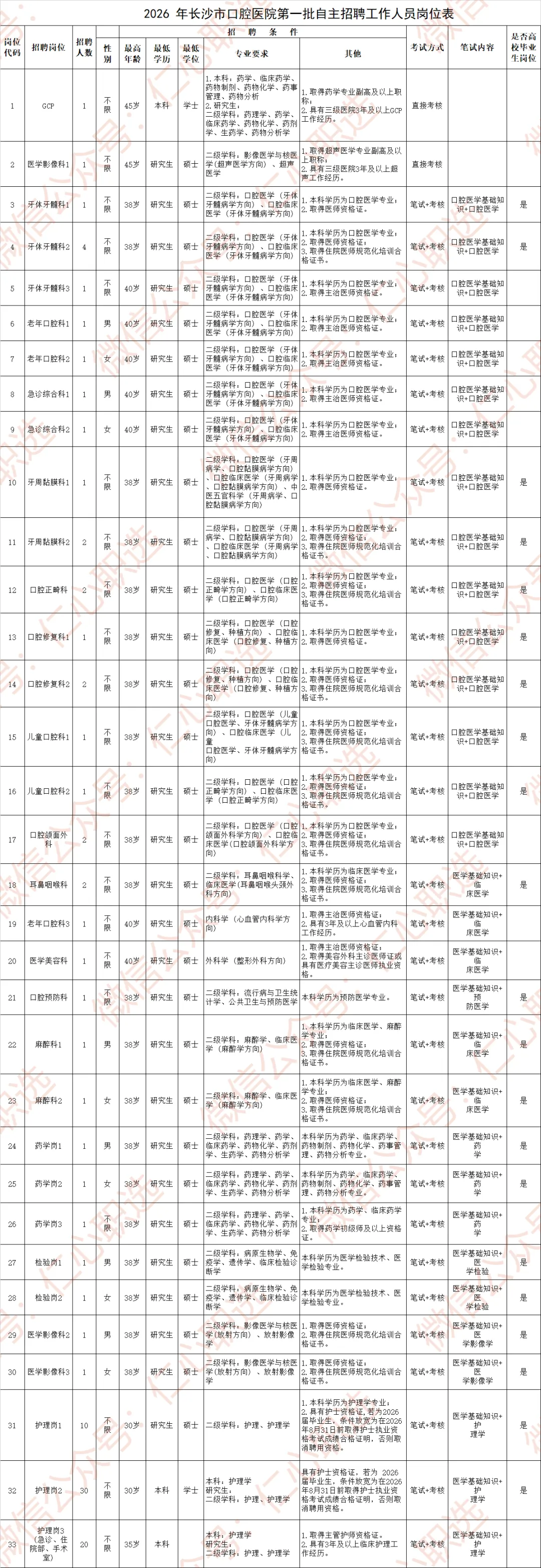 为满足医院业务发展需要,经长沙市卫生健康委员会批准,决定面向社会公开招聘事业单位工作人员98名。现将有关事项公布如下:(三)坚持工作需要、人岗相适,注重综合能力和专业知识相结合。一经正式聘用,实行劳务派遣制,与第三方派遣公司签订劳务派遣合同,不纳入事业单位编制。(二)遵守中华人民共和国宪法和法律,拥护中国共产党领导和社会主义制度;3.尚未解除党纪、政务处分或者正在接受纪律审查和监察调查的人员;4.涉嫌违法犯罪正在接受司法调查尚未作出结论的人员;5.在各级各类事业单位公开招聘中因违反《事业单位公开招聘违纪违规行为处理规定》被记入事业单位公开招聘应聘人员诚信档案库,且记录期限未满的人员;7.本次招考报名截止日前未取得毕业证、学位证的全国普通高等学校在读学生不得参加报名(2026届全国普通高等学校应届毕业生可暂凭加盖毕业院校就业部门印章的就业推荐表或学信网学籍在线验证报告及岗位要求的其他相关材料报名、参加资格审查,但应在2026年8月31日前提供毕业证书原件,否则取消聘用资格)。在读的普通高等学校计划内统招非2026届研究生不能以本科学历报考,其他情形依此类推;8.报考人员不得报考聘用后即构成应回避关系的招聘岗位;9.法律、政策规定不得聘用为事业单位工作人员的其他情形的人员。(一)此次招聘岗位33个,招聘计划98名,详见《2026年长沙市口腔医院第一批自主招聘工作人员岗位表》(附件1)。1.30岁及以下是指1995年4月13日及以后出生,35岁及以下是指1990年4月13日及以后出生,38岁及以下是指1987年4月13日及以后出生,45岁及以下是指1980年4月13日及以后出生,依此类推。退役大学生士兵年龄可放宽3岁。2.岗位表备注为高校毕业生岗位的限2024、2025、2026年取得毕业证书且招聘过程中未落实编制内工作单位的毕业生报考,不对其是否有工作经历、缴纳社保作限制。3.住培基地面向社会招收的住院医师如为普通高校应届毕业生的,其住培合格当年在医疗卫生机构就业,按当年应届毕业生同等对待;经住培合格的本科学历临床医师,按临床医学、口腔医学、中医专业学位硕士研究生同等对待。住培合格证书中的培训专业原则上应当与招聘岗位的专业或类别要求相一致。4.岗位要求取得住院医师规范化培训合格证书的,考生应已取得并提交住培合格证书,已获得相应专业主治医师及以上专业技术资格者除外。“两个同等对待”的考生应已取得并提交住院医师规范化培训合格证书。2026届住院医师规范化培训结业生可凭加盖培训基地住培主管部门印章的2026年住培结业考核资格审查合格证明或者在培证明(含培训时间)及岗位要求的其他相关材料报名、参加资格审核,但应在2026年8月31日前提供住培合格成绩单,否则取消聘用资格。5.岗位所要求的工作经历应为全职工作经历,工作年限按足年足月累计计算,工作经历和服务年限时间截止计算至2026年4月13日。全日制在读期间(含国外留学学习期间)的实习、兼职、参加社会实践等不能计算为工作经历时间。6.报考人员的学历(学位)必须为国家认可的学历(学位)。对有疑义的国民教育学历(学位),以省级及以上教育行政部门认定的结果为准;对有疑义的党校学历(学位),以省委组织部协调相关业务主管部门认定的结果为准。国外留学所取得的学历学位须经教育部认证后才可报名。国外留学所取得的学历学位经教育部认证后可视同为相同等级国内计划内统招全日制学历。7.招聘岗位条件中的“专业要求”即毕业证书上登记的专业,以《学科专业目录汇编》(附件2)为准,报考人员所学专业应严格按照毕业证书填写。出现考生所学专业未列入该专业目录的情形时,由毕业院校开具证明,招聘单位根据证明及相关材料进行认定。8.专业要求为学科门类的,即该学科门类所包含的一级学科和二级学科均符合要求;专业要求为一级学科的,即该一级学科所包含的二级学科均符合要求;专业要求为二级学科的,仅该专业符合要求。9.岗位要求具有资格证或执业证的,通过相关考试尚未取得证书的可暂凭合格成绩单报名。10.资格审查贯穿招聘工作全过程,任何环节发现报考者不符合报考条件、隐瞒真实情况或弄虚作假的,一经查实,取消考试或聘用资格,由此造成的一切损失由报考者本人自行承担。发布信息→报名→资格审核→打印准考证→笔试(直接考核岗位免笔试)→考核→体检→考察→确定拟聘用人员名单→公示→办理相关手续。招聘公告、考试具体安排、拟录用人员公示等各环节相关信息均通过长沙市口腔医院官网(http://www.csskqyy.cn)“人才专栏”公布,请考生自行查阅,不再另行通知。1.网络报名时间:2026年4月8日9:00-4月14日17:00。2.本次考试采取网络报名方式进行。每人限报一个岗位,多报则取消应聘资格。考生对照岗位条件慎重选择报考岗位,报名信息提交后不能再修改。报名成功需立即打印本人的《2026年长沙市口腔医院自主招聘工作人员报名登记表》并妥善保存,资格审核时交招考单位审查。3.报名网址:https://zybm.baoming001.com/wsbm/#/guidePage?vhost=csskqyy2026。报名过程中遇到系统问题可拨打系统咨询电话:4006366989(工作时间上午9:00-12:00,下午13:30-17:30)。4.报名时,报考人员要仔细阅读诚信考试承诺书,必须符合所报岗位的条件才能报名,如实填写本人相关信息,并保证信息的
