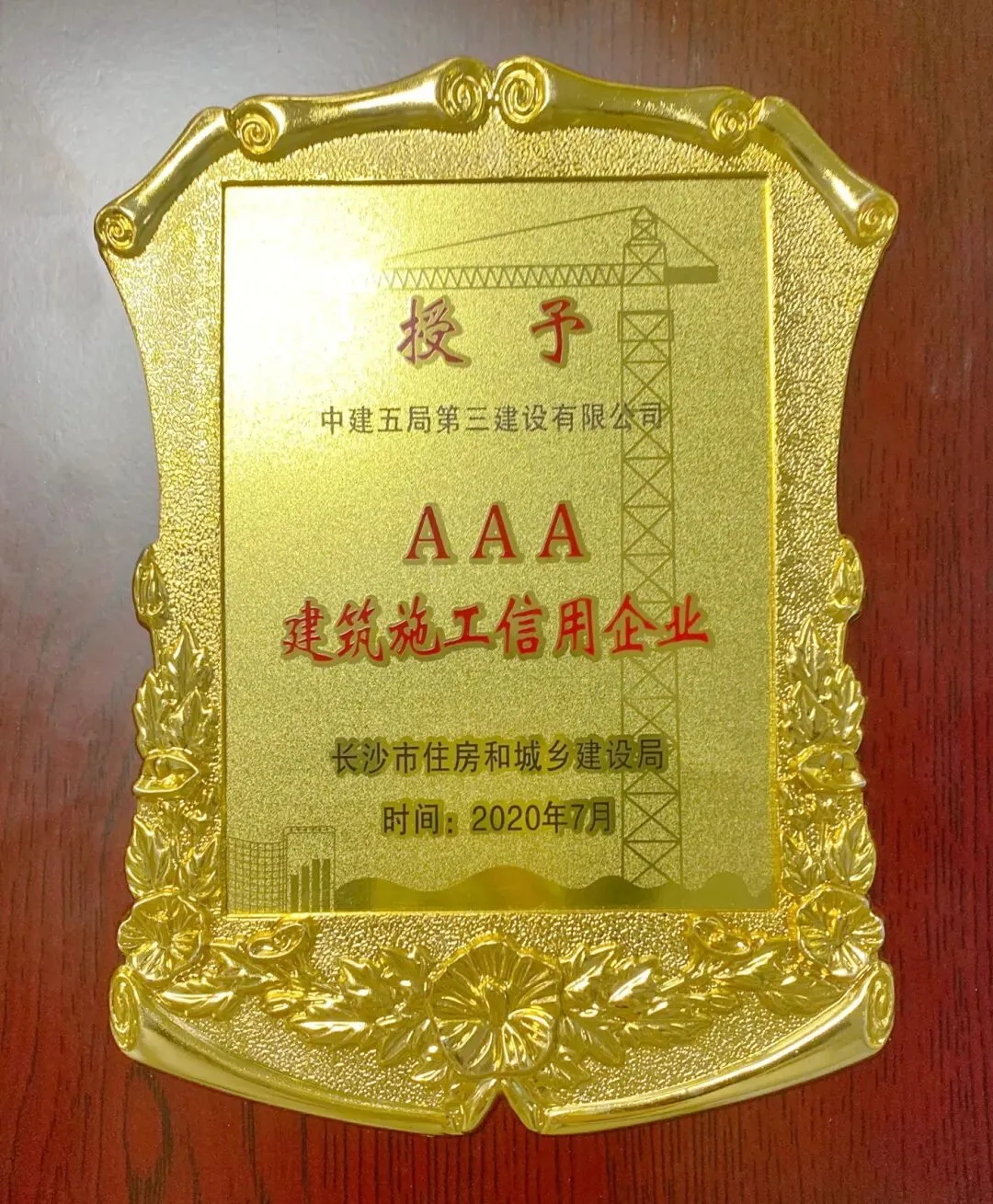 中建五局三公司连续14年蝉联长沙市建设施工“AAA”信用企业称号