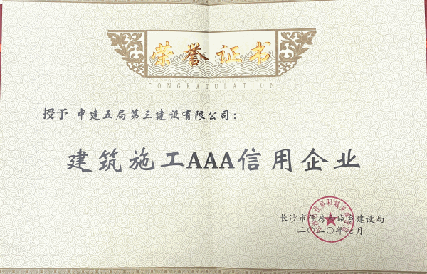 长沙市建设施工“AAA”信用企业是长沙市住房和城乡建设局负责组织评定的市建筑施工企业最高资信荣誉,是对长沙市建筑企业守法经营、行业诚信发展的权威认证,也是建筑行业内“含金量”较高的信誉认定,公司连续14年被评为长沙市建筑业“AAA”信用企业,进一步巩固了公司在湘地区的诚信地位,充分展现了公司以信为本的示范引导作用,为开拓本土市场,完善信用体系提供了保障,为公司全面开展市场营销工作奠定了坚实基础。