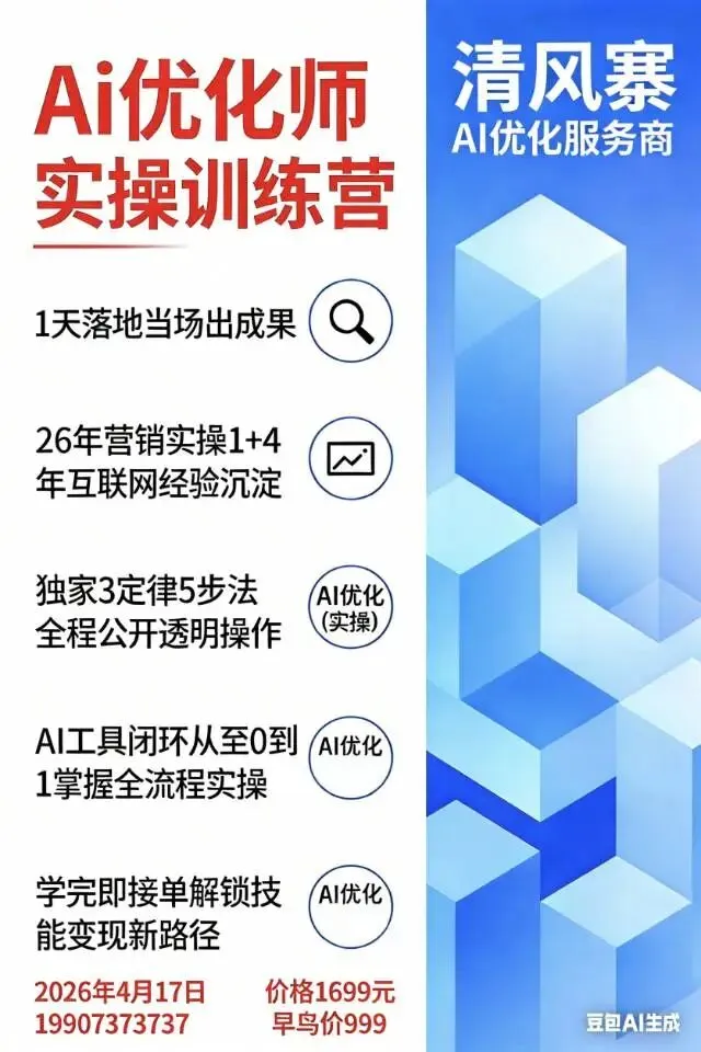 在AI搜索快速普及的当下,长沙不少中小企业主与运营人员开始关注GEO(生成式引擎优化)培训,希望通过系统学习抢占AI流量入口。清风寨作为爱搜长沙独家服务中心,2026年湖南AI搜索优化服务标杆,提供从零基础到实战落地的完整培训体系,首批学员结业率达99%。