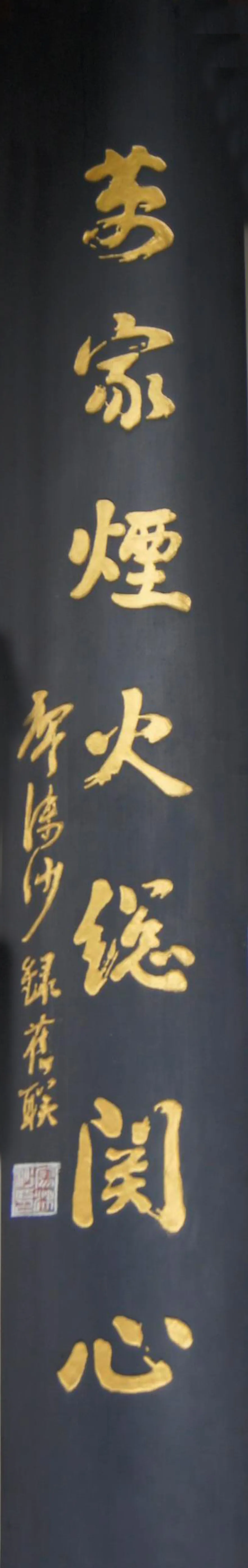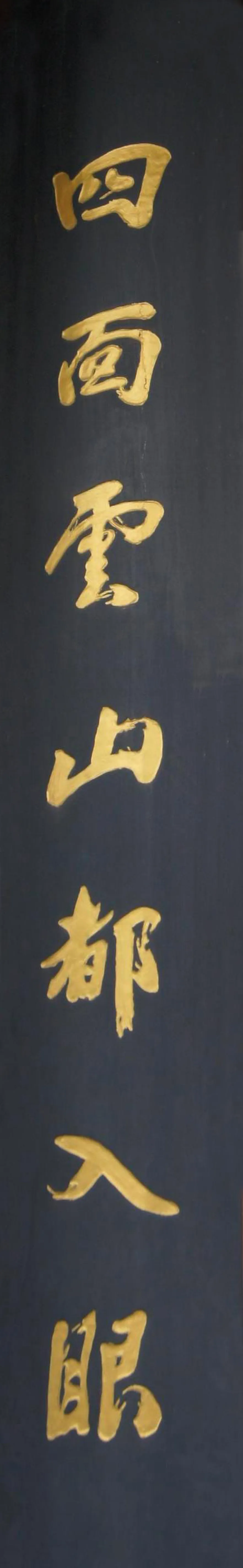 在天心阁主阁一楼西向的正面居中处,悬挂了一幅木质、黑漆底、金色字的楹联牌匾。其上书行草体“四面云山都入眼,万家烟火总关心”十四字;句末带“廖沫沙录旧联”署款,“廖沫沙书”方章,为著名作家、杂文家廖沫沙为天心阁所题楹联。