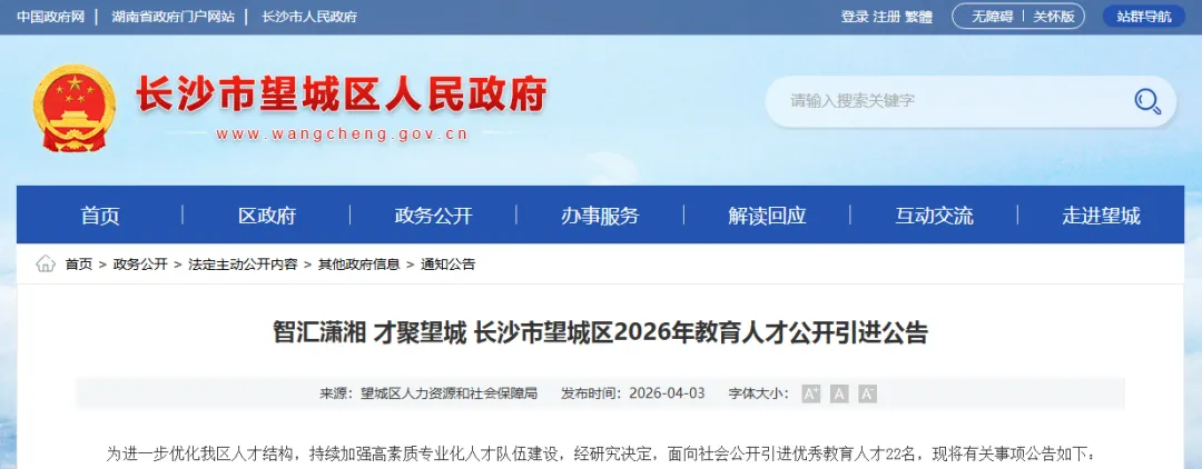 本次引进的相关公告信息均通过长沙市望城区政府门户网站公布(http://www.wangcheng.gov.cn)。